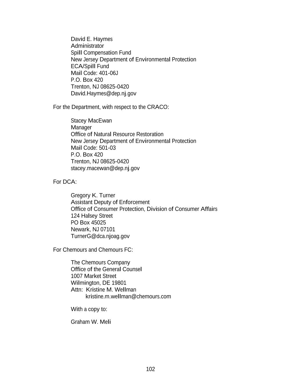 102 David E. Haymes Administrator Spill Compensation Fund New Jersey Department of Environmental Protection ECA/Spill Fund Mail Code: 401-06J P.O. Box 420 Trenton, NJ 08625-0420 David.Haymes@dep.nj.gov For the Department, with respect to the CRACO: Stacey MacEwan Manager Office of Natural Resource Restoration New Jersey Department of Environmental Protection Mail Code: 501-03 P.O. Box 420 Trenton, NJ 08625-0420 stacey.macewan@dep.nj.gov For DCA: Gregory K. Turner Assistant Deputy of Enforcement Office of Consumer Protection, Division of Consumer Affairs 124 Halsey Street PO Box 45025 Newark, NJ 07101 TurnerG@dca.njoag.gov For Chemours and Chemours FC: The Chemours Company Office of the General Counsel 1007 Market Street Wilmington, DE 19801 Attn: Kristine M. Wellman kristine.m.wellman@chemours.com With a copy to: Graham W. Meli