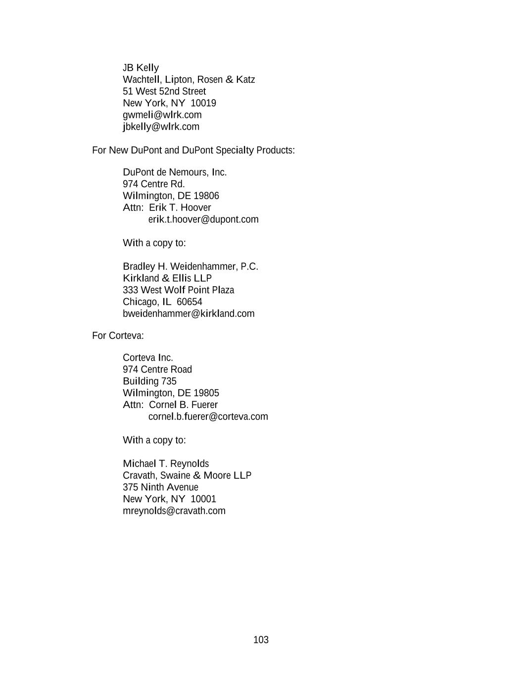 103 JB Kelly Wachtell, Lipton, Rosen & Katz 51 West 52nd Street New York, NY 10019 gwmeli@wlrk.com jbkelly@wlrk.com For New DuPont and DuPont Specialty Products: DuPont de Nemours, Inc. 974 Centre Rd. Wilmington, DE 19806 Attn: Erik T. Hoover erik.t.hoover@dupont.com With a copy to: Bradley H. Weidenhammer, P.C. Kirkland & Ellis LLP 333 West Wolf Point Plaza Chicago, IL 60654 bweidenhammer@kirkland.com For Corteva: Corteva Inc. 974 Centre Road Building 735 Wilmington, DE 19805 Attn: Cornel B. Fuerer cornel.b.fuerer@corteva.com With a copy to: Michael T. Reynolds Cravath, Swaine & Moore LLP 375 Ninth Avenue New York, NY 10001 mreynolds@cravath.com