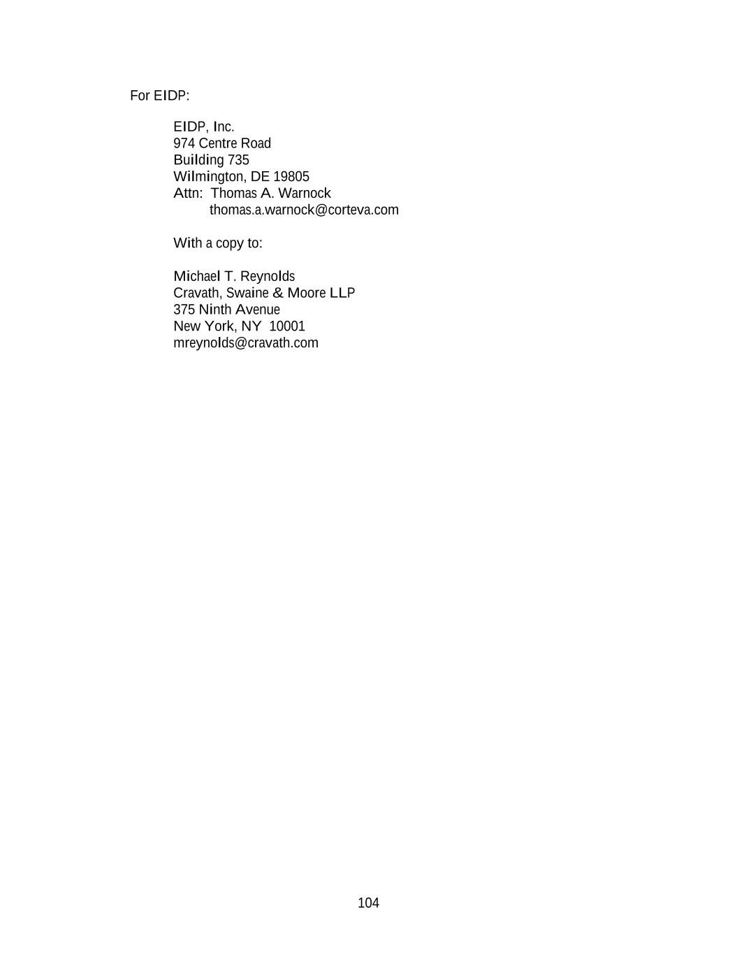 104 For EIDP: EIDP, Inc. 974 Centre Road Building 735 Wilmington, DE 19805 Attn: Thomas A. Warnock thomas.a.warnock@corteva.com With a copy to: Michael T. Reynolds Cravath, Swaine & Moore LLP 375 Ninth Avenue New York, NY 10001 mreynolds@cravath.com