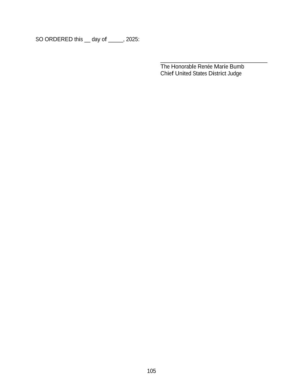 105 SO ORDERED this __ day of _____, 2025: ____________________________________ The Honorable Renée Marie Bumb Chief United States District Judge