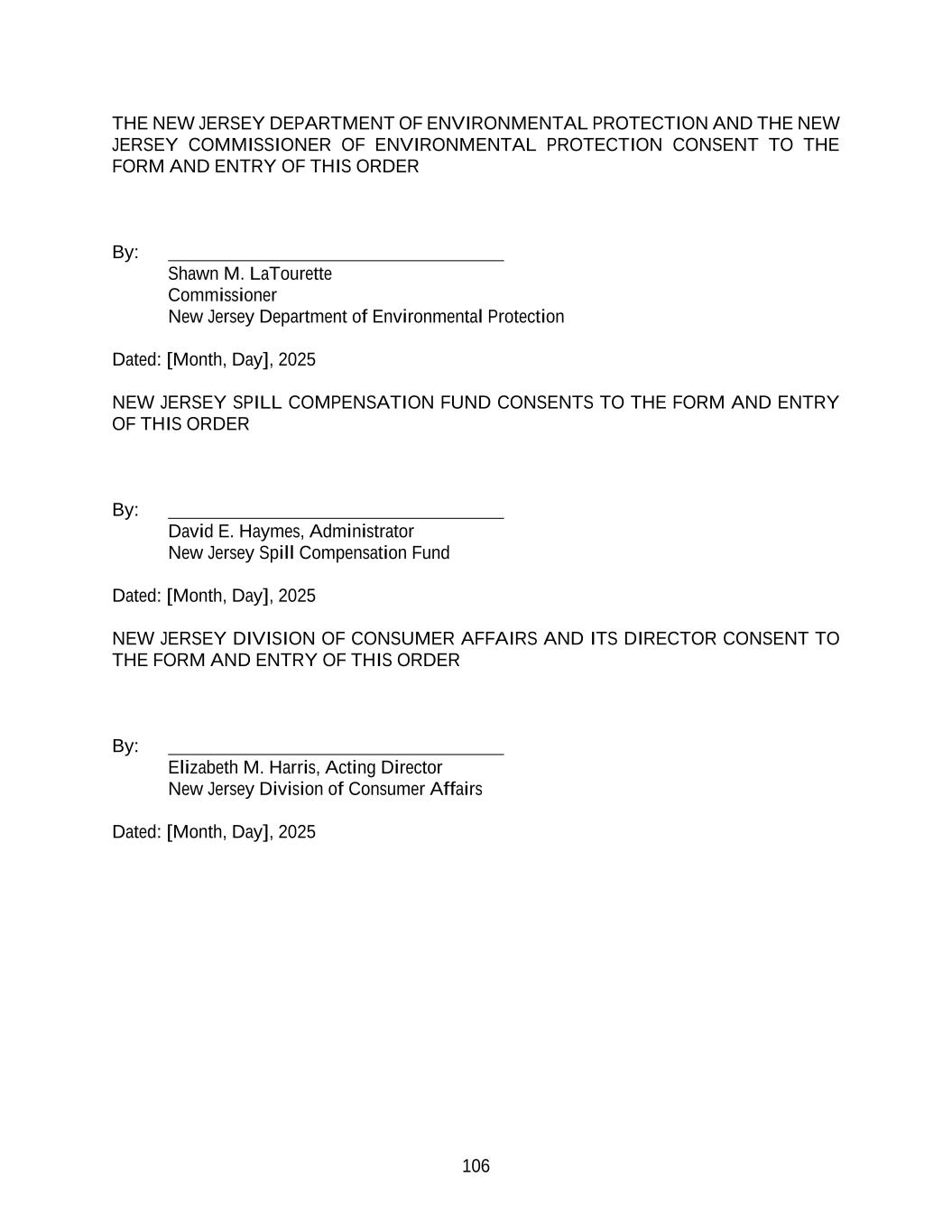 106 THE NEW JERSEY DEPARTMENT OF ENVIRONMENTAL PROTECTION AND THE NEW JERSEY COMMISSIONER OF ENVIRONMENTAL PROTECTION CONSENT TO THE FORM AND ENTRY OF THIS ORDER By: Shawn M. LaTourette Commissioner New Jersey Department of Environmental Protection Dated: [Month, Day], 2025 NEW JERSEY SPILL COMPENSATION FUND CONSENTS TO THE FORM AND ENTRY OF THIS ORDER By: David E. Haymes, Administrator New Jersey Spill Compensation Fund Dated: [Month, Day], 2025 NEW JERSEY DIVISION OF CONSUMER AFFAIRS AND ITS DIRECTOR CONSENT TO THE FORM AND ENTRY OF THIS ORDER By: Elizabeth M. Harris, Acting Director New Jersey Division of Consumer Affairs Dated: [Month, Day], 2025