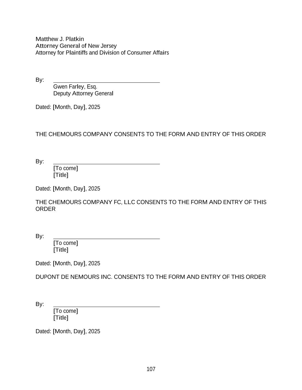 107 Matthew J. Platkin Attorney General of New Jersey Attorney for Plaintiffs and Division of Consumer Affairs By: Gwen Farley, Esq. Deputy Attorney General Dated: [Month, Day], 2025 THE CHEMOURS COMPANY CONSENTS TO THE FORM AND ENTRY OF THIS ORDER By: [To come] [Title] Dated: [Month, Day], 2025 THE CHEMOURS COMPANY FC, LLC CONSENTS TO THE FORM AND ENTRY OF THIS ORDER By: [To come] [Title] Dated: [Month, Day], 2025 DUPONT DE NEMOURS INC. CONSENTS TO THE FORM AND ENTRY OF THIS ORDER By: [To come] [Title] Dated: [Month, Day], 2025