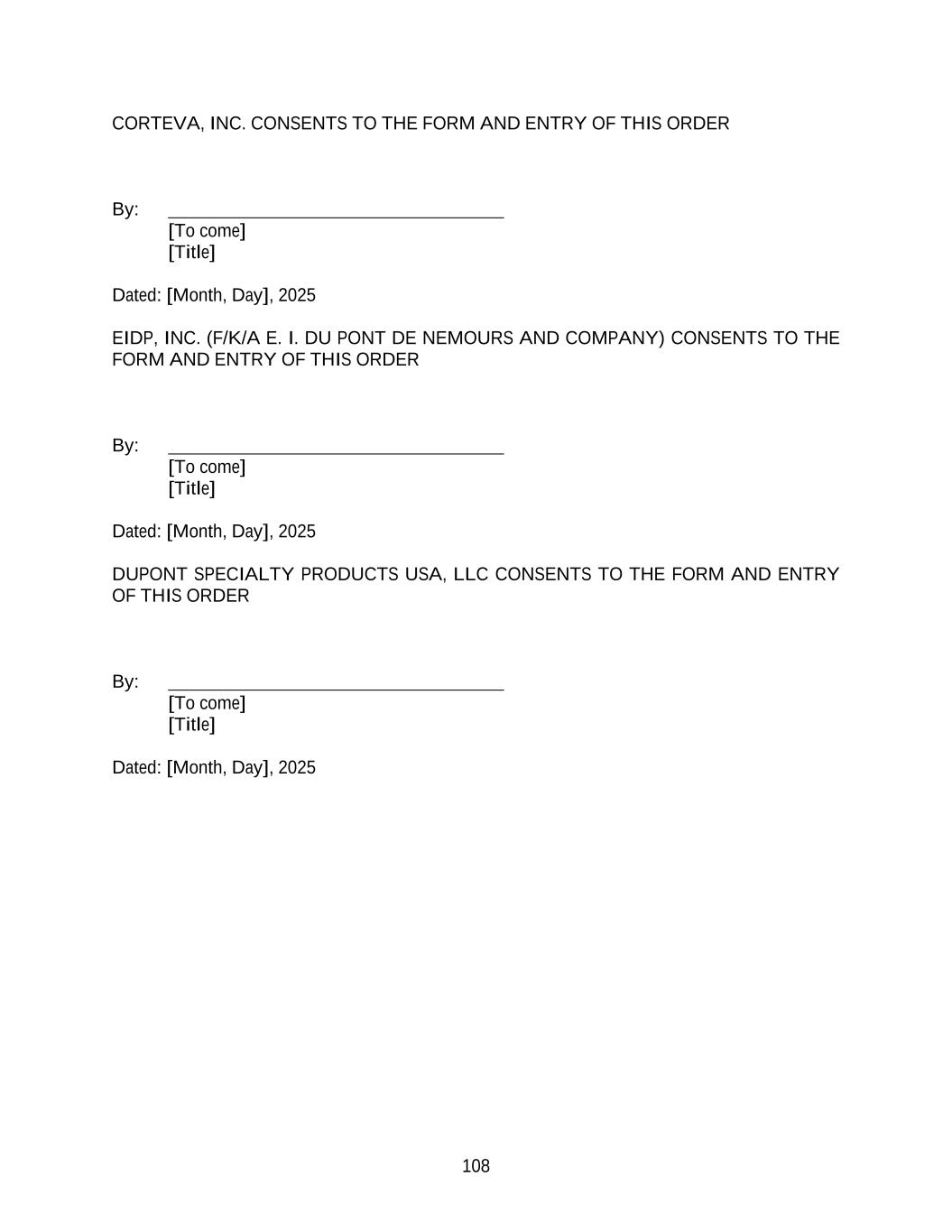 108 CORTEVA, INC. CONSENTS TO THE FORM AND ENTRY OF THIS ORDER By: [To come] [Title] Dated: [Month, Day], 2025 EIDP, INC. (F/K/A E. I. DU PONT DE NEMOURS AND COMPANY) CONSENTS TO THE FORM AND ENTRY OF THIS ORDER By: [To come] [Title] Dated: [Month, Day], 2025 DUPONT SPECIALTY PRODUCTS USA, LLC CONSENTS TO THE FORM AND ENTRY OF THIS ORDER By: [To come] [Title] Dated: [Month, Day], 2025