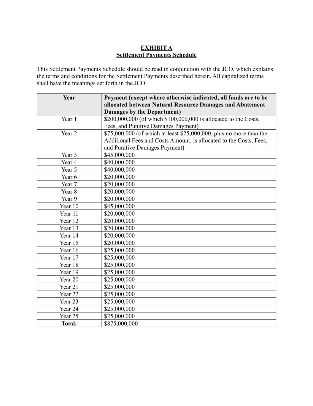 EXHIBIT A Settlement Payments Schedule This Settlement Payments Schedule should be read in conjunction with the JCO, which explains the terms and conditions for the Settlement Payments described herein. All capitalized terms shall have the meanings set forth in the JCO. Year Payment (except where otherwise indicated, all funds are to be allocated between Natural Resource Damages and Abatement Damages by the Department) Year 1 $200,000,000 (of which $100,000,000 is allocated to the Costs, Fees, and Punitive Damages Payment) Year 2 $75,000,000 (of which at least $25,000,000, plus no more than the Additional Fees and Costs Amount, is allocated to the Costs, Fees, and Punitive Damages Payment) Year 3 $45,000,000 Year 4 $40,000,000 Year 5 $40,000,000 Year 6 $20,000,000 Year 7 $20,000,000 Year 8 $20,000,000 Year 9 $20,000,000 Year 10 $45,000,000 Year 11 $20,000,000 Year 12 $20,000,000 Year 13 $20,000,000 Year 14 $20,000,000 Year 15 $20,000,000 Year 16 $25,000,000 Year 17 $25,000,000 Year 18 $25,000,000 Year 19 $25,000,000 Year 20 $25,000,000 Year 21 $25,000,000 Year 22 $25,000,000 Year 23 $25,000,000 Year 24 $25,000,000 Year 25 $25,000,000 Total: $875,000,000