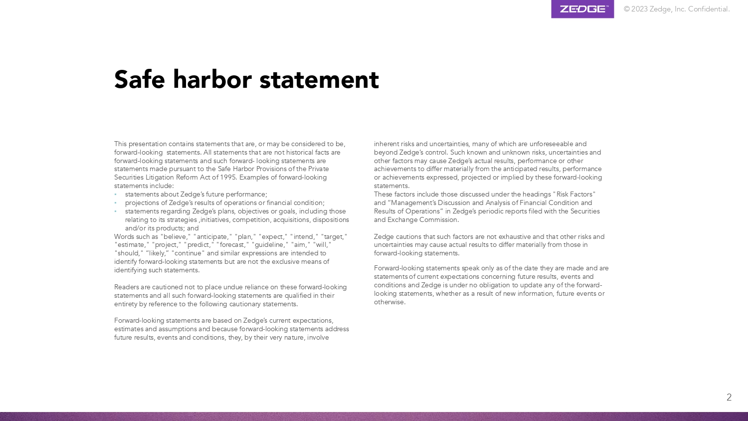 © 2023 Zedge, Inc. Confidential. 2 This presentation contains statements that are, or may be considered to be, forward - looking statements. All statements that are not historical facts are forward - looking statements and such forward - looking statements are statements made pursuant to the Safe Harbor Provisions of the Private Securities Litigation Reform Act of 1995. Examples of forward - looking statements include: • statements about Zedge’s future performance; • projections of Zedge’s results of operations or financial condition; • statements regarding Zedge’s plans, objectives or goals, including those relating to its strategies ,initiatives, competition, acquisitions, dispositions and/or its products; and Words such as "believe," "anticipate," "plan," "expect," "intend," "target," "estimate," "project," "predict," "forecast," "guideline," "aim," "will," "should," “likely,” "continue" and similar expressions are intended to identify forward - looking statements but are not the exclusive means of identifying such statements. Readers are cautioned not to place undue reliance on these forward - looking statements and all such forward - looking statements are qualified in their entirety by reference to the following cautionary statements. Forward - looking statements are based on Zedge’s current expectations, estimates and assumptions and because forward - looking statements address future results, events and conditions, they, by their very nature, involve inherent risks and uncertainties, many of which are unforeseeable and beyond Zedge’s control. Such known and unknown risks, uncertainties and other factors may cause Zedge’s actual results, performance or other achievements to differ materially from the anticipated results, performance or achievements expressed, projected or implied by these forward - looking statements. These factors include those discussed under the headings "Risk Factors" and “Management’s Discussion and Analysis of Financial Condition and Results of Operations” in Zedge’s periodic reports filed with the Securities and Exchange Commission. Zedge cautions that such factors are not exhaustive and that other risks and uncertainties may cause actual results to differ materially from those in forward - looking statements. Forward - looking statements speak only as of the date they are made and are statements of current expectations concerning future results, events and conditions and Zedge is under no obligation to update any of the forward - looking statements, whether as a result of new information, future events or otherwise. Safe harbor statement