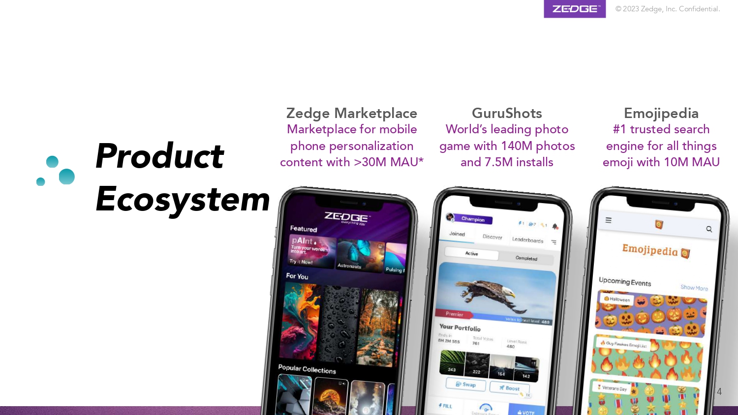 © 2023 Zedge, Inc. Confidential. Product Ecosystem GuruShots World’s leading photo game with 140M photos and 7.5M installs 4 Zedge Marketplace Marketplace for mobile phone personalization content with >30M MAU* Emojipedia #1 trusted search engine for all things emoji with 10M MAU