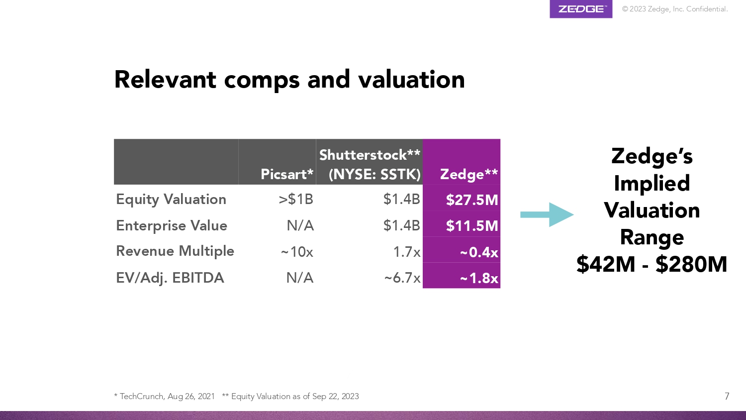 © 2023 Zedge, Inc. Confidential. 6 Why now is the time to Invest! ZDGE has never been better positioned to create sustainable , profitable, long - term growth from a market, product, tech, marketing and team perspective • We are doing AI, not talking about it • Untapped exposure to mobile gaming • Targeting UA payback of 3 - 12 months • Exceptionally undervalued • Active buyback strategy $1.91 Stock Price (Sep 22, 2023) $1.29 Cash per Share (Q3 FY ’23)
