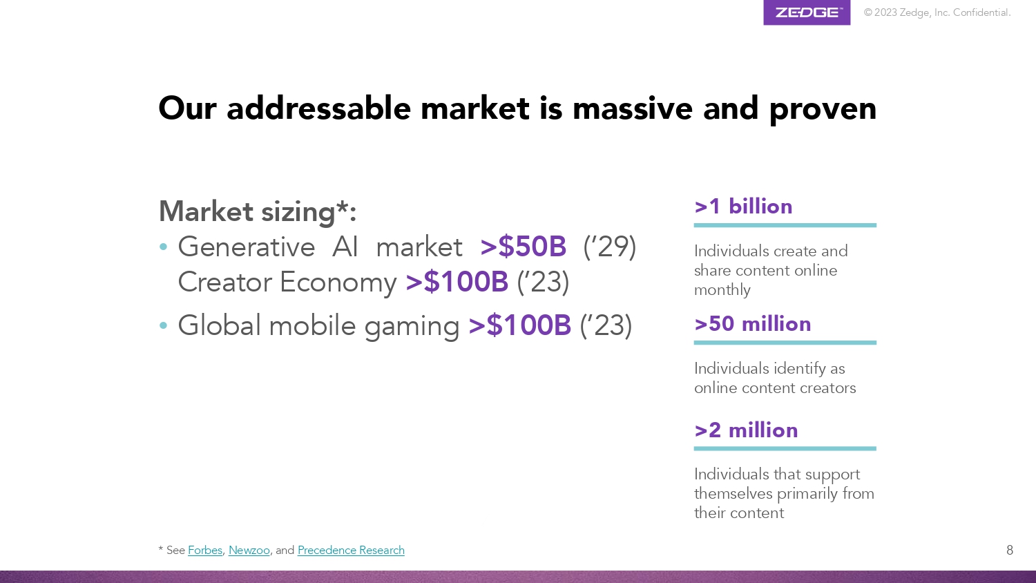 © 2023 Zedge, Inc. Confidential. Our addressable market is massive and proven 8 Individuals create and share content online monthly >50 million Individuals identify as online content creators >2 million Individuals that support themselves primarily from their content >1 billion Market sizing*: • Generative AI market >$50B (’29) Creator Economy >$100B (’23) • Global mobile gaming >$100B (’23) * See Forbes , Newzoo , and Precedence Research