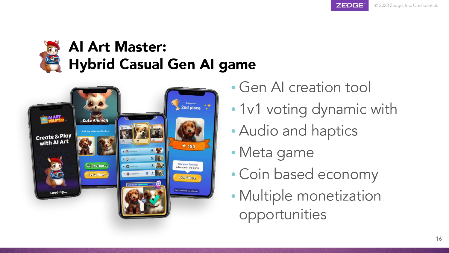 © 2023 Zedge, Inc. Confidential. AI Art Master: Hybrid Casual Gen AI game • Gen AI creation tool • 1v1 voting dynamic with • Audio and haptics • Meta game • Coin based economy • Multiple monetization opportunities 16