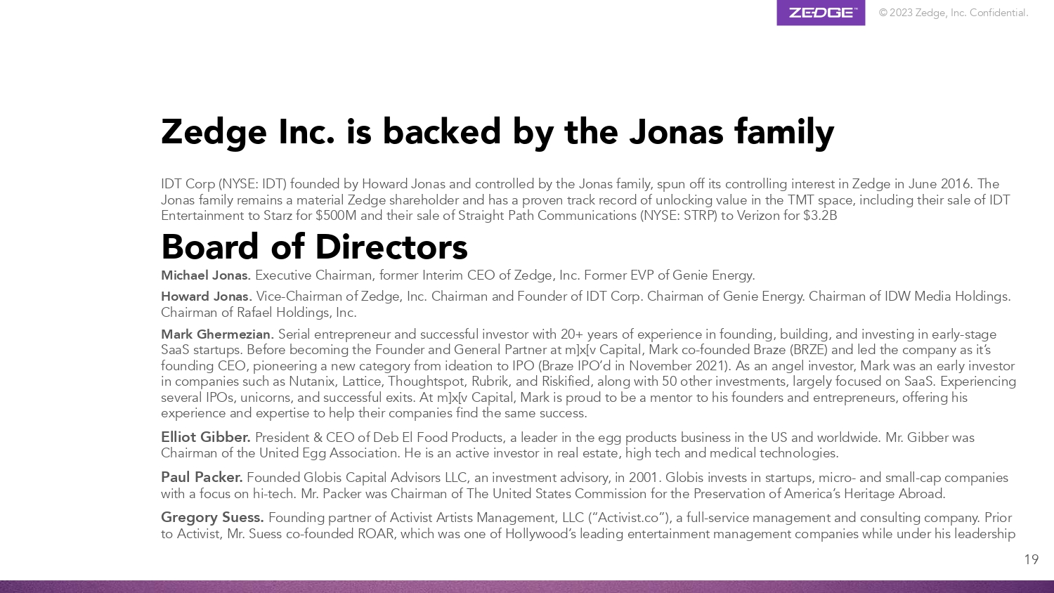 © 2023 Zedge, Inc. Confidential. 18 Jonathan Reich CEO, Zedge, Inc. Jonathan has been our CEO since August ‘20 and as our President since July ’11. He has also served as our CFO (’16 - ’20) and COO (’11 - ’20). From ’07 to ’14, Mr. Reich served as President of Fabrix Systems, Inc. and, from 1999 to 2007, he served in various positions at Net2Phone, Inc., culminating with him as CEO of Net2Phone Global Services. Mr. Reich received a B.S. and M.S. in Operations Research from Columbia University’s School of Engineering and Applied Science in 1989 and 1993, respectively. Yi Tsai CFO, Zedge, Inc. Yi has served as our CFO and Treasurer since August ’20 and as Controller (’16 and ’20). Previously, he served as CFO of Peerless Systems Corporation (NASDAQ). He began his career in public accounting and has held positions with various financial institutions and multinational corporations. Yi is a CPA with a BS in Accounting from National Taipei University and an MBA in Finance from Case Western Reserve University’s Weatherhead School of Management. Tim Quirk SVP, Product, Zedge, Inc. Tim has served as SVP of Product since selling Freeform Development, a marketplace for musicians, to Zedge in ’17. Prior to Freeform he helped build Google Play as Google's Head of Global Content Programming, and ran the music content and operations team for Rhapsody, one of the first on - demand music streaming services. He's also the singer and lyricist for the punk - pop band Too Much Joy (Warner Brothers Records). Key management: skilled and experienced team Gilon Miller GM & Co - Founder of GuruShots Gilon is an entrepreneur and engineer with over 18 years of experience in the software and internet businesses. Prior to founding GuruShots (acquired by Zedge Inc. in April ’22) he held key positions in several successful start - ups, including Upstream Commerce (acquired by Flipkart), iMDSoft (acquired by TPG Capital) and Friendly Robotics (acquired by MTD Products / Stanley Black & Decker). BSEE from Tufts University and an MBA from the Massachusetts Institute of Technology (MIT).
