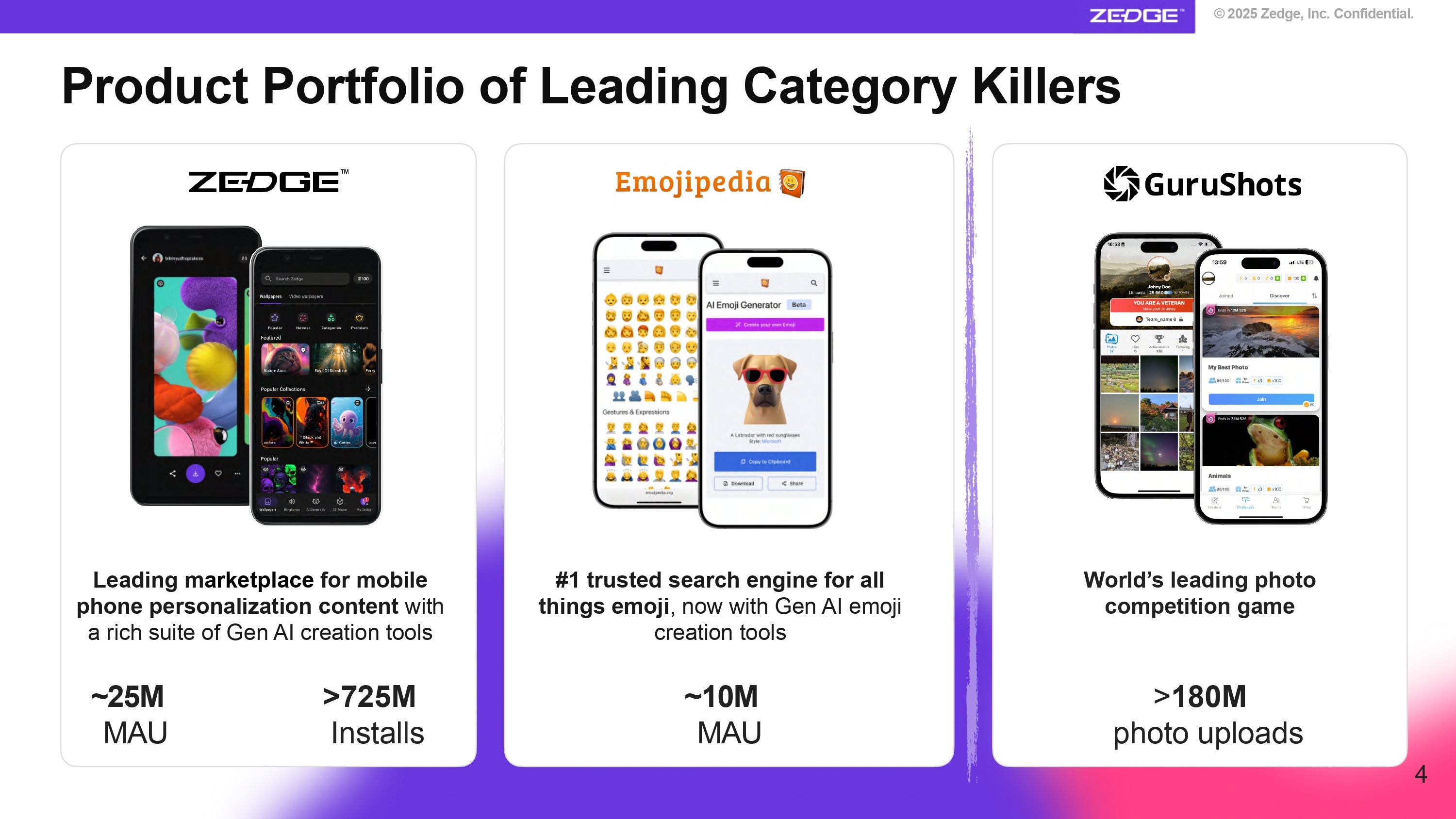 © 2025 Zedge, Inc. Confidential. 3 $29M Market cap* $9M Enterprise Value* ~50% Free Cash Flow (FCF) Yield** About Zedge • We are experts in monetizing large user bases • We provide artists with tools, community, recognition, and the ability to make $$$ • We provide users with great content and a fun experience We do all of this utilizing Gen AI, gamification, fun competitions, and an awesome UX Our marketplaces create a powerful flwheel Zedge provides marketplaces for user - generated content (UGC) $20M Cash / No Debt $5M Buyback underway COMMERCE COMMUNITY COMPETITION CREATION MARKETING * As of April 16, 2025 ** Based off of enterprise value and TTM FCF