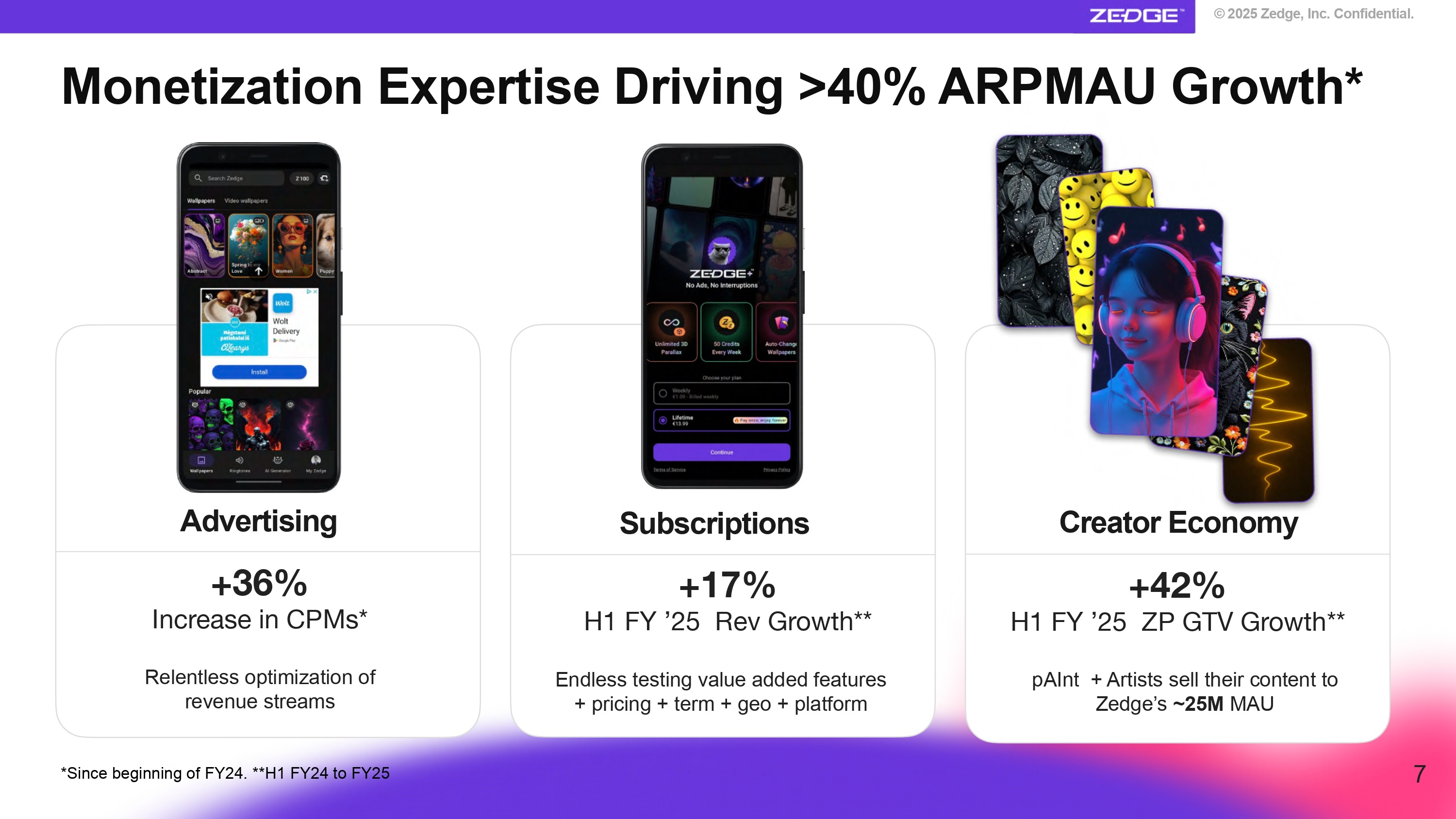 © 2025 Zedge, Inc. Confidential. This presentation contains statements that are, or may be considered to be, forward - looking statements. All statements that are not historical facts are forward - looking statements and such forward - looking statements are statements made pursuant to the Safe Harbor Provisions of the Private Securities Litigation Reform Act of 1995. Examples of forward - looking statements include: • statements about Zedge’s future performance; • projections of Zedge’s results of operations or financial condition; • statements regarding Zedge’s plans, objectives or goals, including those relating to its strategies ,initiatives, competition, acquisitions, dispositions and/or its products ; and Words such as "believe," "anticipate," "plan," "expect," "intend," "target," "estimate," "project," "predict," "forecast," "guideline," "aim," "will," "should," “likely,” "continue" and similar expressions are intended to identify forward - looking statements but are not the exclusive means of identifying such statements. Readers are cautioned not to place undue reliance on these forward - looking statements and all such forward - looking statements are qualified in their entirety by reference to the following cautionary statements. Forward - looking statements are based on Zedge’s current expectations, estimates and assumptions and because forward - looking statements address future results, events and conditions, they, by their very nature, involve inherent risks and uncertainties, many of which are unforeseeable and beyond Zedge’s control. Such known and unknown risks, uncertainties and other factors may cause Zedge’s actual results, performance or other achievements to differ materially from the anticipated results, performance or achievements expressed, projected or implied by these forward - looking statements. These factors include those discussed under the headings "Risk Factors" and “Management’s Discussion and Analysis of Financial Condition and Results of Operations” in Zedge’s periodic reports filed with the Securities and Exchange Commission . Zedge cautions that such factors are not exhaustive and that other risks and uncertainties may cause actual results to differ materially from those in forward - looking statements. Forward - looking statements speak only as of the date they are made and are statements of current expectations concerning future results, events and conditions and Zedge is under no obligation to update any of the forward - looking statements, whether as a result of new information, future events or otherwise. 2 Safe Harbor Statement