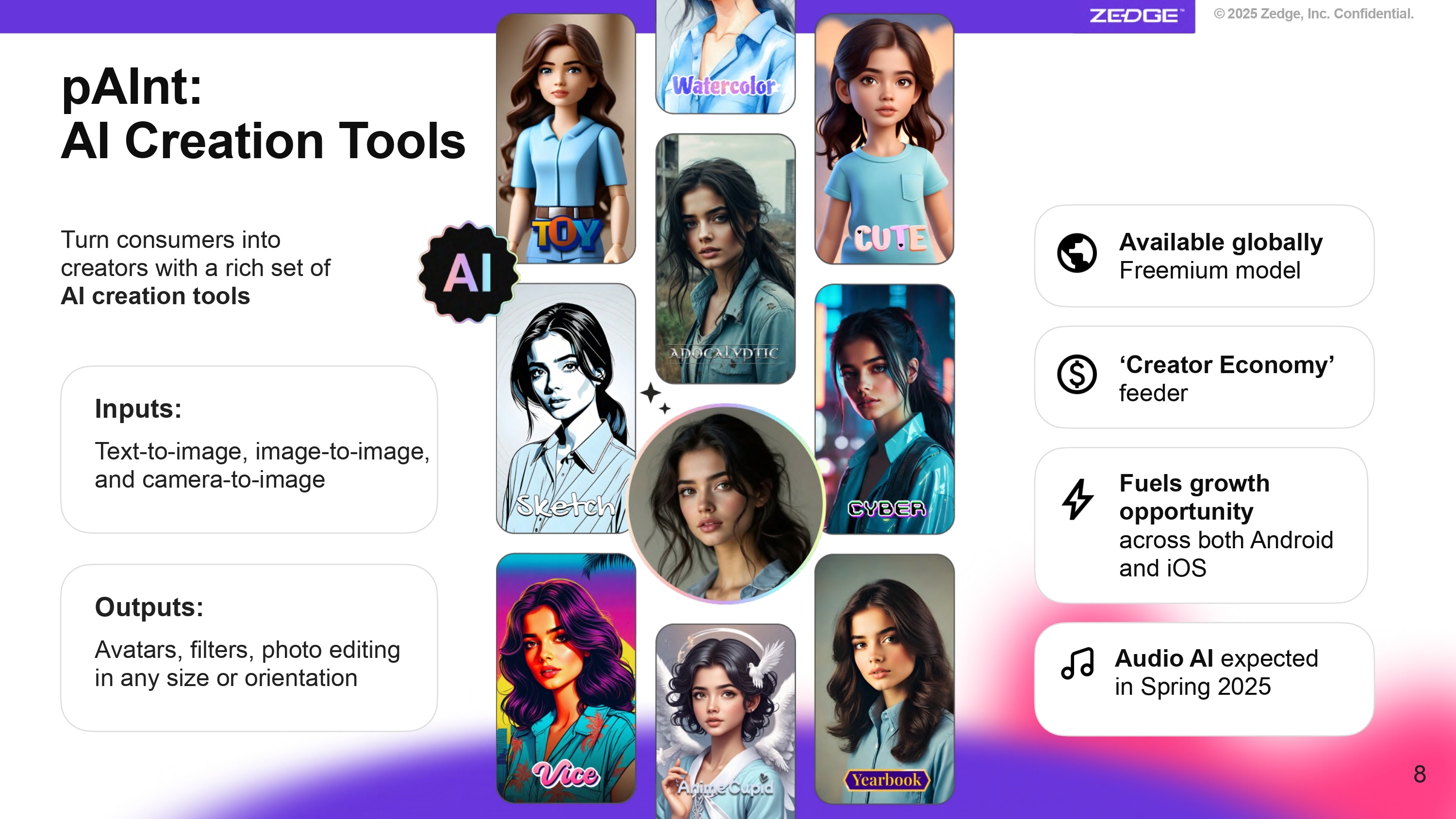 © 2025 Zedge, Inc. Confidential. 7 Monetization Expertise Driving >40% ARPMAU Growth* *Since beginning of FY24. **H1 FY24 to FY25 +42% H1 FY ’25 ZP GTV Growth** Creator Economy pAInt + Artists sell their content to Zedge’s ~25M MAU Subscriptions Endless testing value added features + pricing + term + geo + platform +17% H1 FY ’25 Rev Growth** Advertising Relentless optimization of revenue streams +36% Increase in CPMs*
