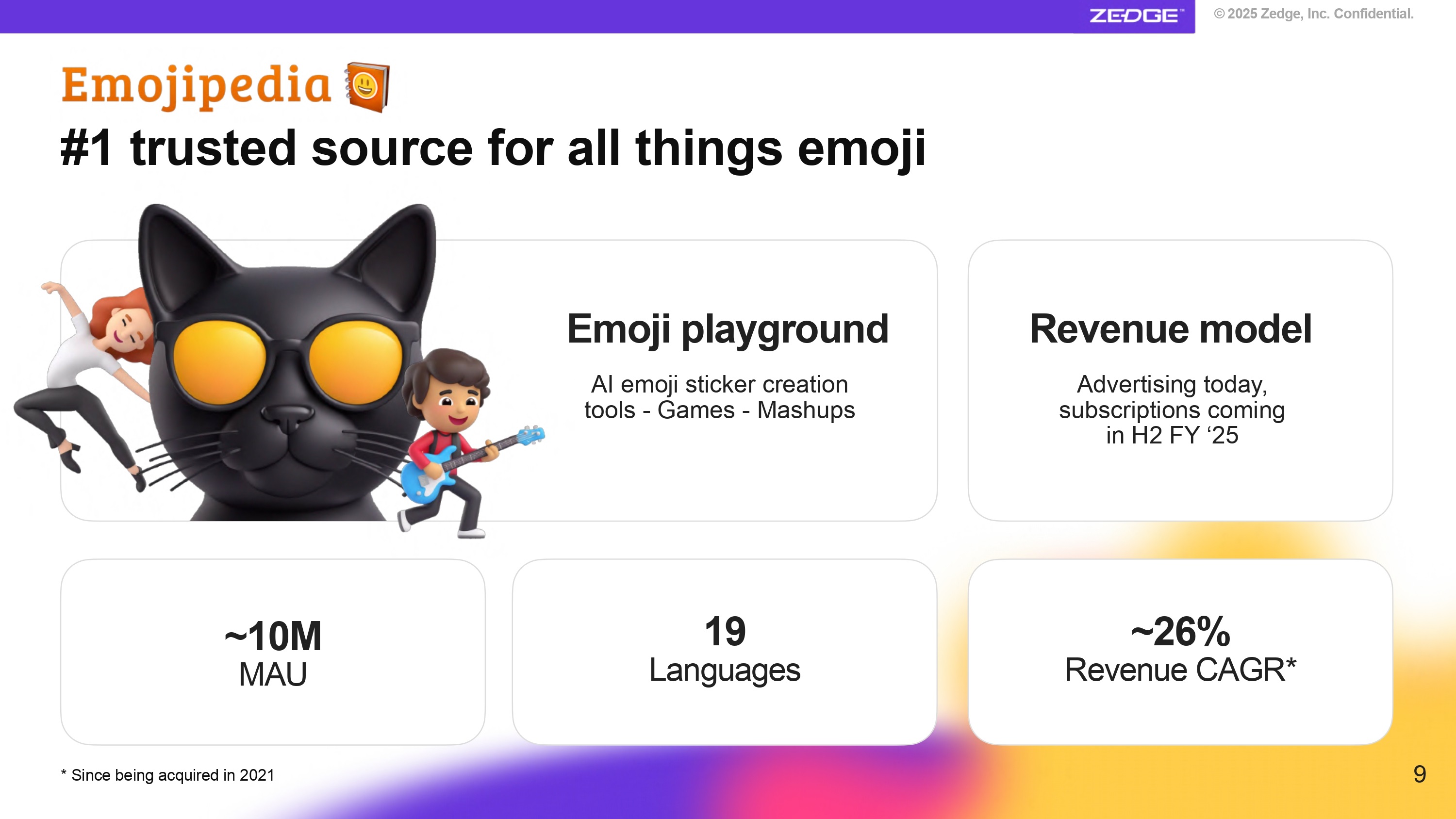© 2025 Zedge, Inc. Confidential. #1 trusted source for all things emoji 9 * Since being acquired in 2021 Emoji playground AI emoji sticker creation tools - Games - Mashups Revenue model Advertising today, subscriptions coming in H2 FY ‘25 ~10M MAU 19 Languages ~26% Revenue CAGR*