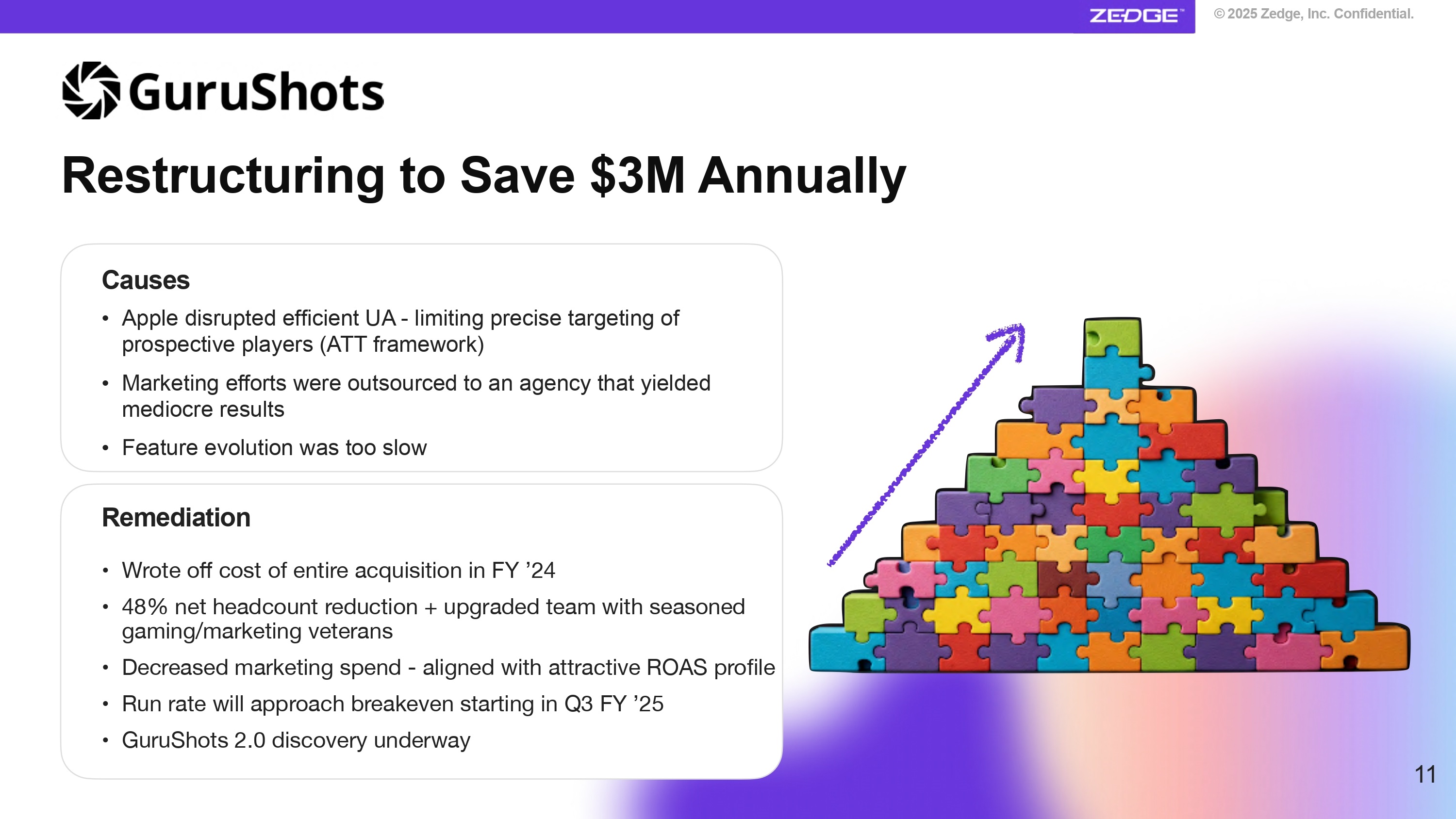 © 2025 Zedge, Inc. Confidential. 11 Restructuring to Save $3M Annually Causes • Apple disrupted efficient UA - limiting precise targeting of prospective players (ATT framework) • Marketing efforts were outsourced to an agency that yielded mediocre results • Feature evolution was too slow Remediation • Wrote off cost of entire acquisition in FY ’24 • 48% net headcount reduction + upgraded team with seasoned gaming/marketing veterans • Decreased marketing spend - aligned with attractive ROAS profile • Run rate will approach breakeven starting in Q3 FY ’25 • GuruShots 2.0 discovery underway