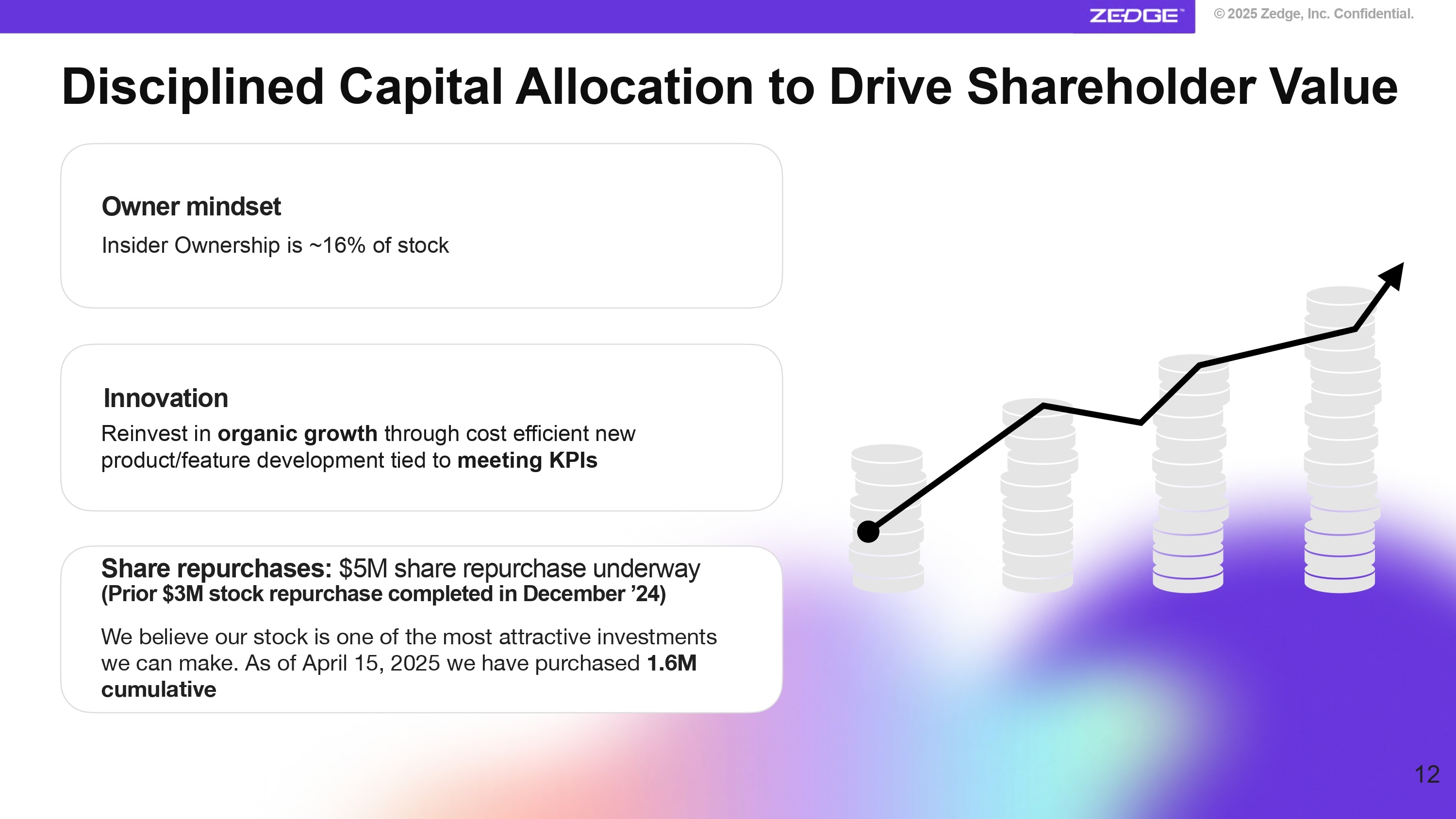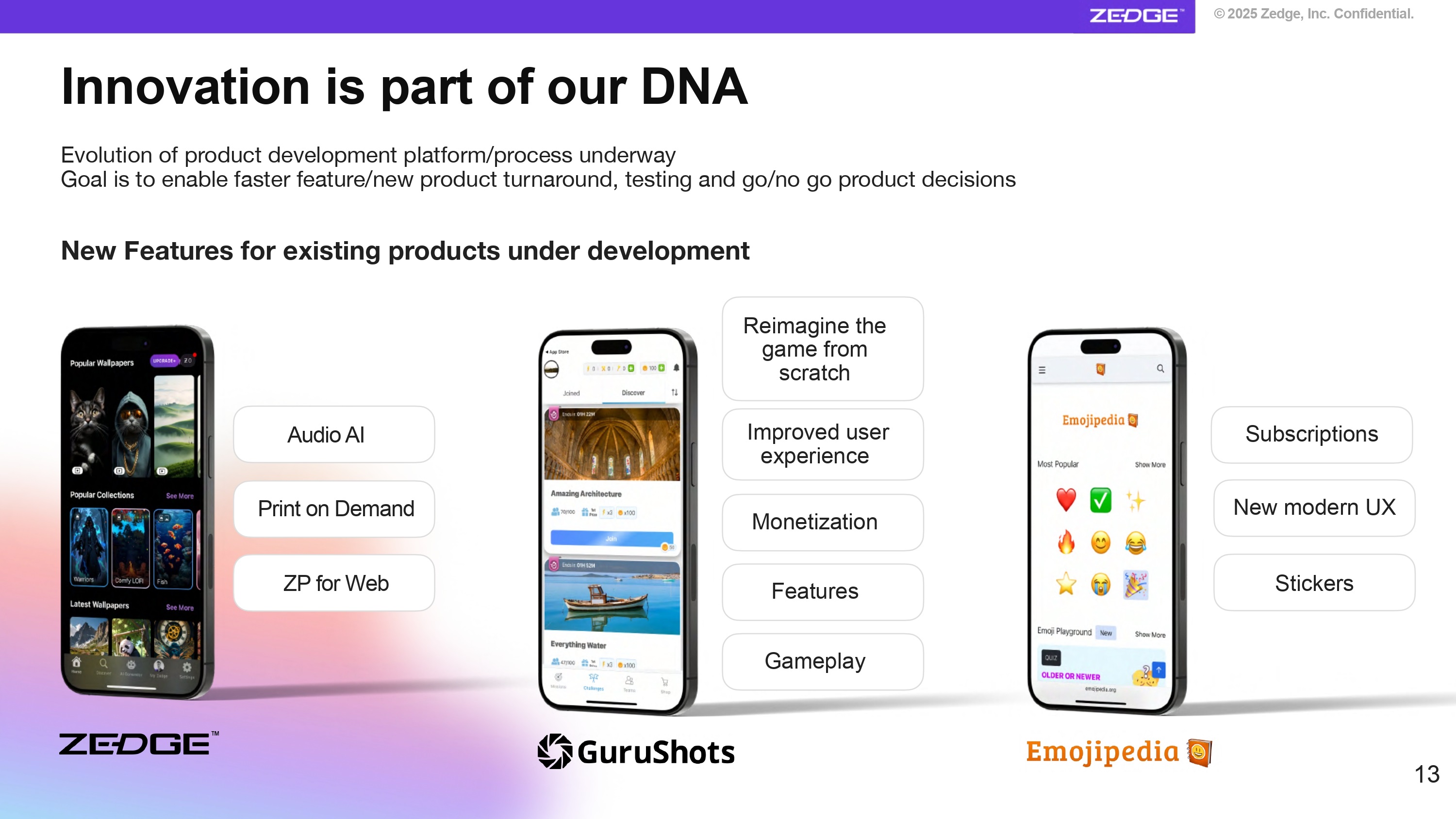 © 2025 Zedge, Inc. Confidential. 12 Disciplined Capital Allocation to Drive Shareholder Value Owner mindset Insider Ownership is ~16% of stock Innovation Reinvest in organic growth through cost efficient new product/feature development tied to meeting KPIs Share repurchases: $5M share repurchase underway (Prior $3M stock repurchase completed in December ’24) We believe our stock is one of the most attractive investments we can make. As of April 15, 2025 we have purchased 1.6M cumulative