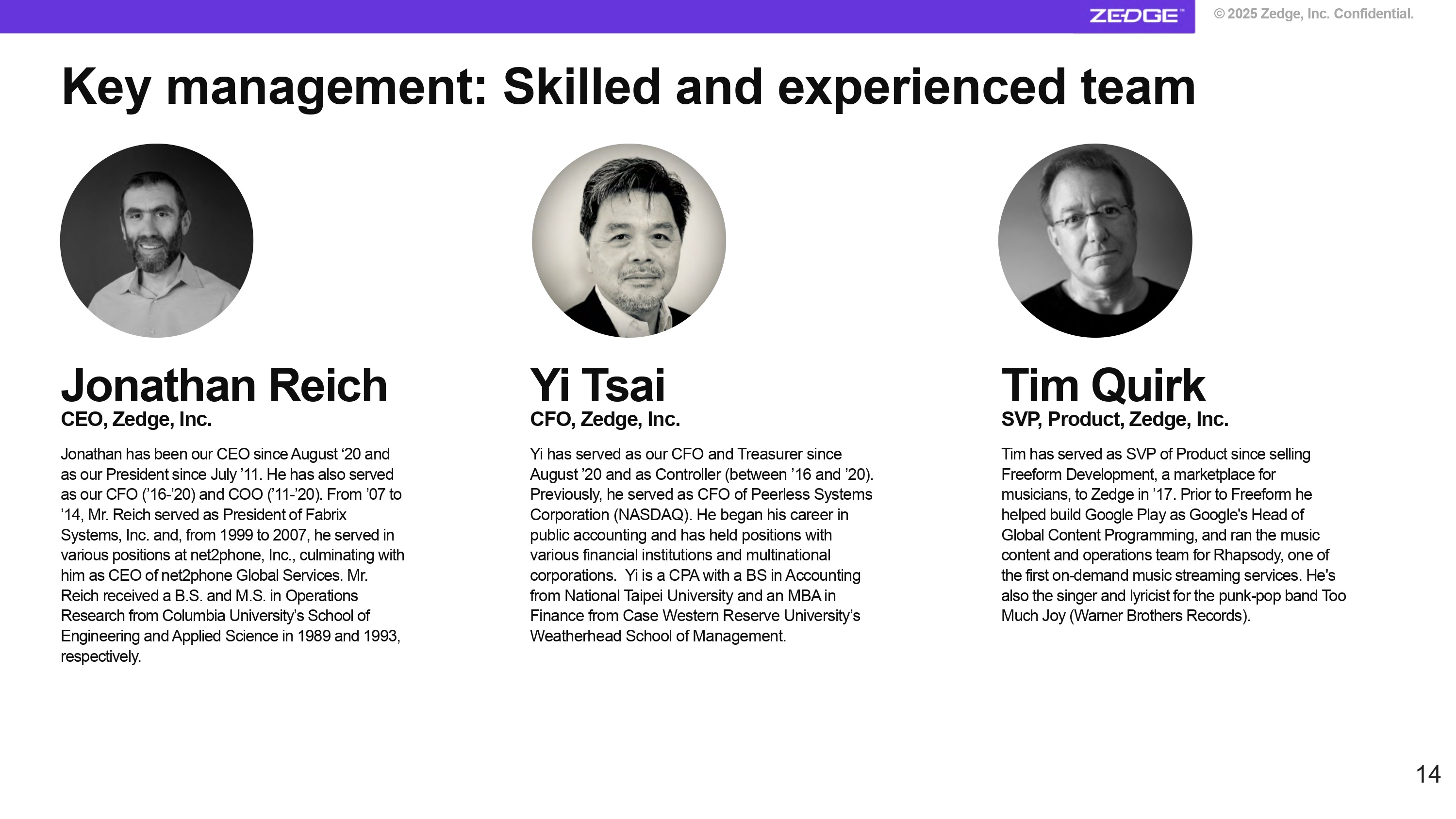 © 2025 Zedge, Inc. Confidential. 13 Innovation is part of our DNA Audio AI Print on Demand ZP for Web Evolution of product development platform/process underway Goal is to enable faster feature/new product turnaround, testing and go/no go product decisions New Features for existing products under development Reimagine the game from scratch Improved user experience Monetization Features Gameplay Subscriptions New modern UX Stickers