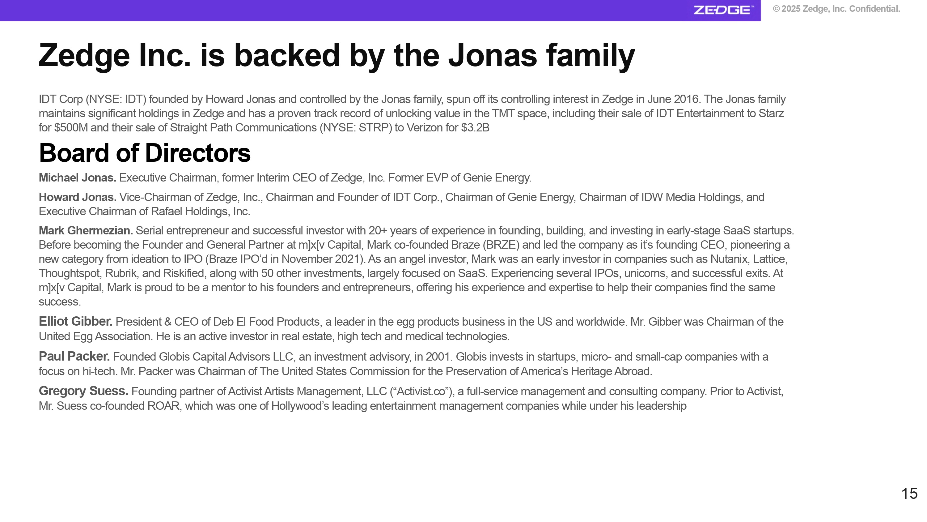 © 2025 Zedge, Inc. Confidential. 15 Zedge Inc. is backed by the Jonas family IDT Corp (NYSE : IDT) founded by Howard Jonas and controlled by the Jonas family, spun off its controlling interest in Zedge in June 2016 . The Jonas family maintains significant holdings in Zedge and has a proven track record of unlocking value in the TMT space, including their sale of IDT Entertainment to Starz for $ 500 M and their sale of Straight Path Communications (NYSE : STRP) to Verizon for $ 3 . 2 B Board of Directors Michael Jonas. Executive Chairman, former Interim CEO of Zedge, Inc. Former EVP of Genie Energy. Howard Jonas. Vice - Chairman of Zedge, Inc., Chairman and Founder of IDT Corp., Chairman of Genie Energy, Chairman of IDW Media Holdings, and Executive Chairman of Rafael Holdings, Inc. Mark Ghermezian. Serial entrepreneur and successful investor with 20+ years of experience in founding, building, and investing in early - stage SaaS startups. Before becoming the Founder and General Partner at m]x[v Capital, Mark co - founded Braze (BRZE) and led the company as it’s founding CEO, pioneering a new category from ideation to IPO (Braze IPO’d in November 2021). As an angel investor, Mark was an early investor in companies such as Nutanix, Lattice, Thoughtspot, Rubrik, and Riskified, along with 50 other investments, largely focused on SaaS. Experiencing several IPOs, unicorns, and successful exits. At m]x[v Capital, Mark is proud to be a mentor to his founders and entrepreneurs, offering his experience and expertise to help their companies find the same success. Elliot Gibber. President & CEO of Deb El Food Products, a leader in the egg products business in the US and worldwide. Mr. Gibber was Chairman of the United Egg Association. He is an active investor in real estate, high tech and medical technologies. Paul Packer. Founded Globis Capital Advisors LLC, an investment advisory, in 2001. Globis invests in startups, micro - and small - cap companies with a focus on hi - tech. Mr. Packer was Chairman of The United States Commission for the Preservation of America’s Heritage Abroad. Gregory Suess. Founding partner of Activist Artists Management, LLC (“Activist.co”), a full - service management and consulting company. Prior to Activist, Mr. Suess co - founded ROAR, which was one of Hollywood’s leading entertainment management companies while under his leadership