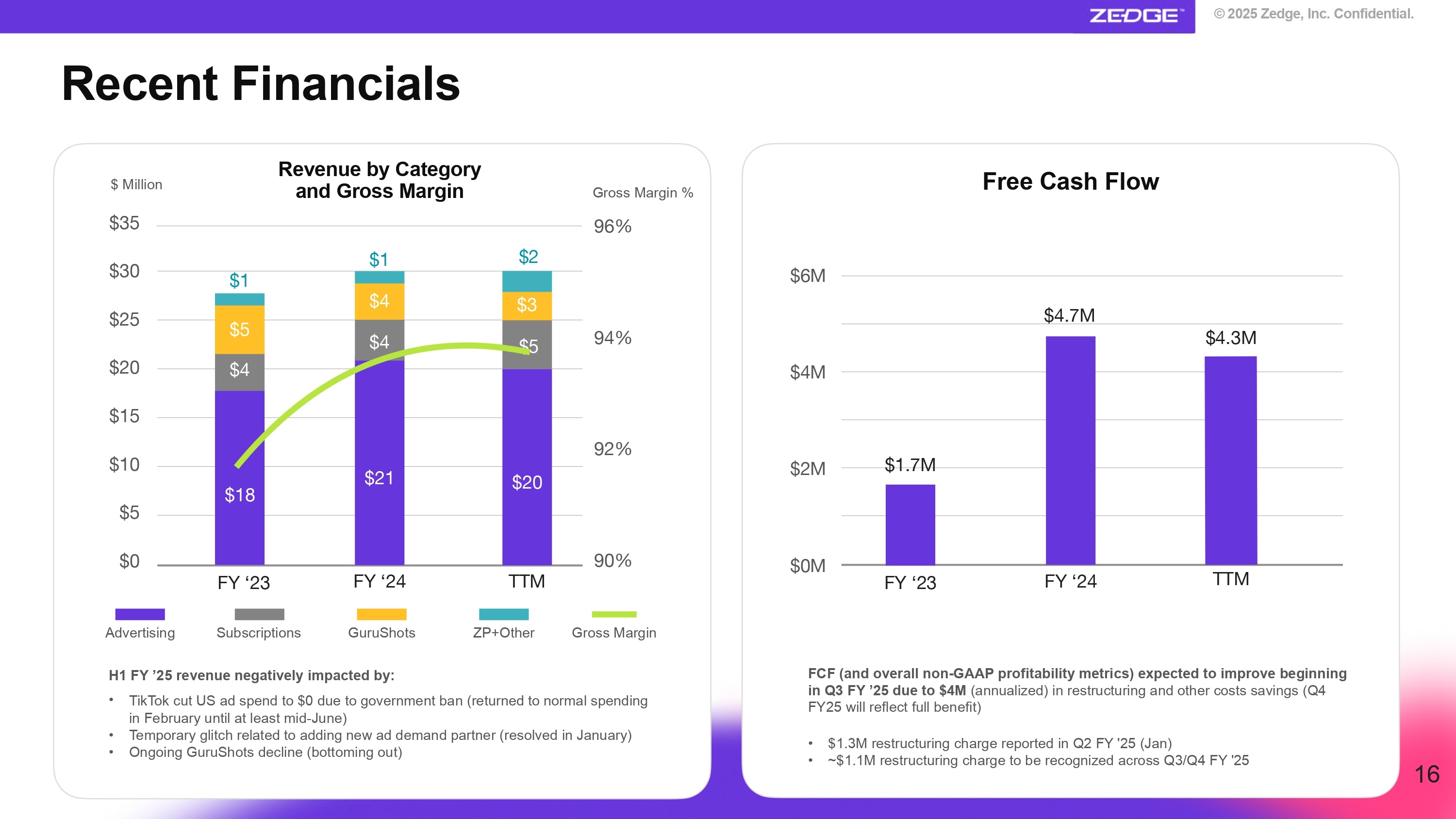 © 2025 Zedge, Inc. Confidential. 16 Recent Financials • TikTok cut US ad spend to $0 due to government ban (returned to normal spending in February until at least mid - June) • Temporary glitch related to adding new ad demand partner (resolved in January) • Ongoing GuruShots decline (bottoming out) $35 $30 $25 $20 $15 $10 $5 $0 FY ‘23 FY ‘24 TTM Revenue by Category and Gross Margin $18 $4 $5 $1 $1 $4 $4 $21 $20 $5 $3 $2 Gross Margin % 96% 94% 92% 90% Advertising Subscriptions GuruShots H1 FY ’25 revenue negatively impacted by: ZP+Other Gross Margin $6M $4M $2M $0M FY ‘23 FY ‘24 TTM FCF (and overall non - GAAP profitability metrics) expected to improve beginning in Q3 FY ’25 due to $4M (annualized) in restructuring and other costs savings (Q4 FY25 will reflect full benefit) • $1.3M restructuring charge reported in Q2 FY '25 (Jan) • ~$1.1M restructuring charge to be recognized across Q3/Q4 FY '25 Free Cash Flow $1.7M $4.7M $4.3M $M Revenue $ Million