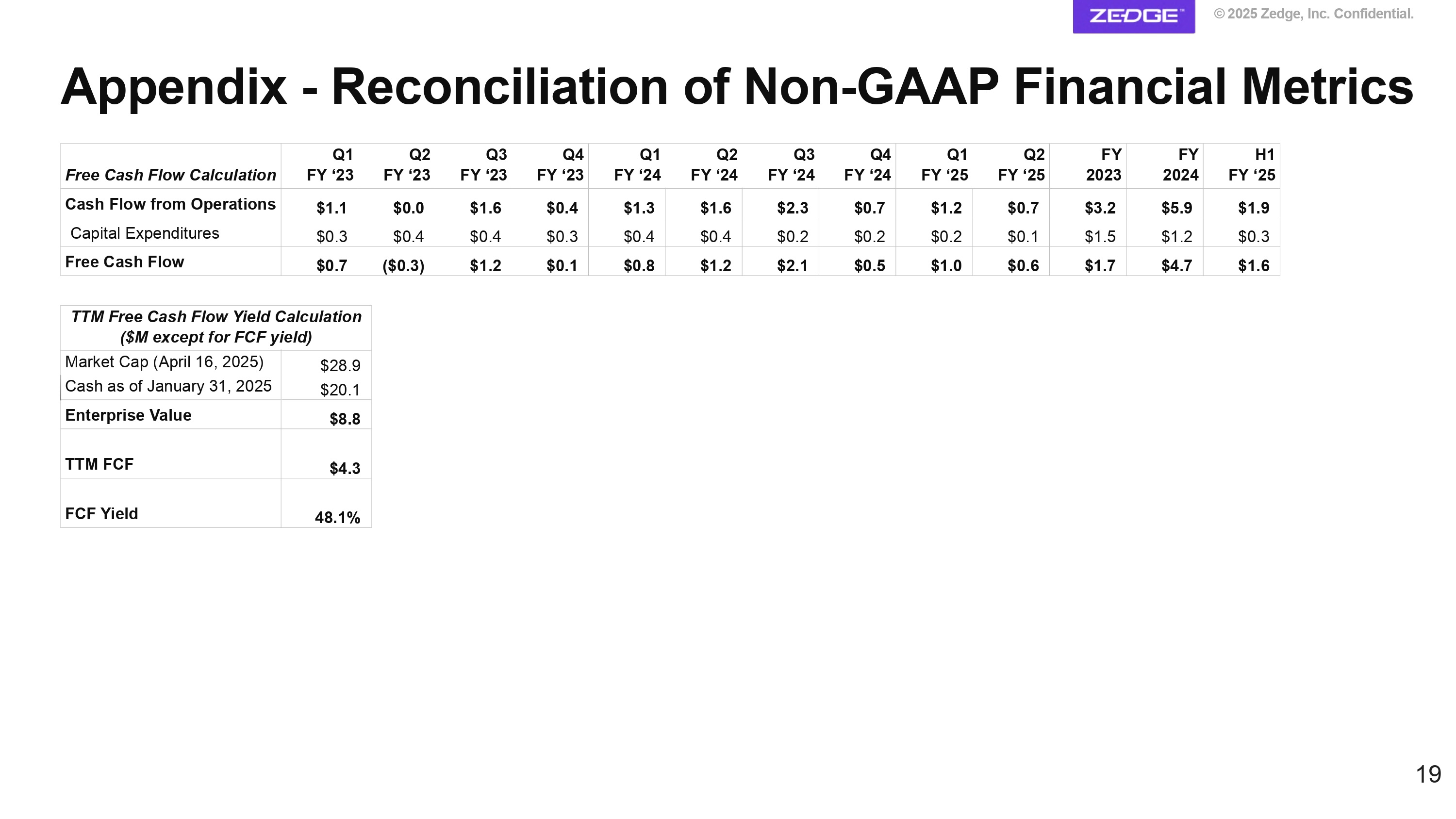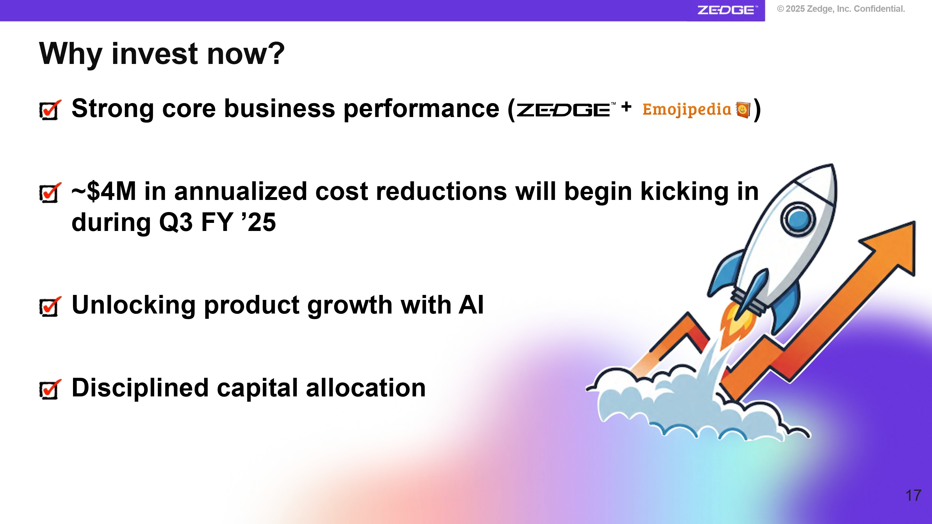 © 2025 Zedge, Inc. Confidential. 17 Why invest now? Strong core business performance ( ) ~$4M in annualized cost reductions will begin kicking in during Q3 FY ’25 Unlocking product growth with AI Disciplined capital allocation +
