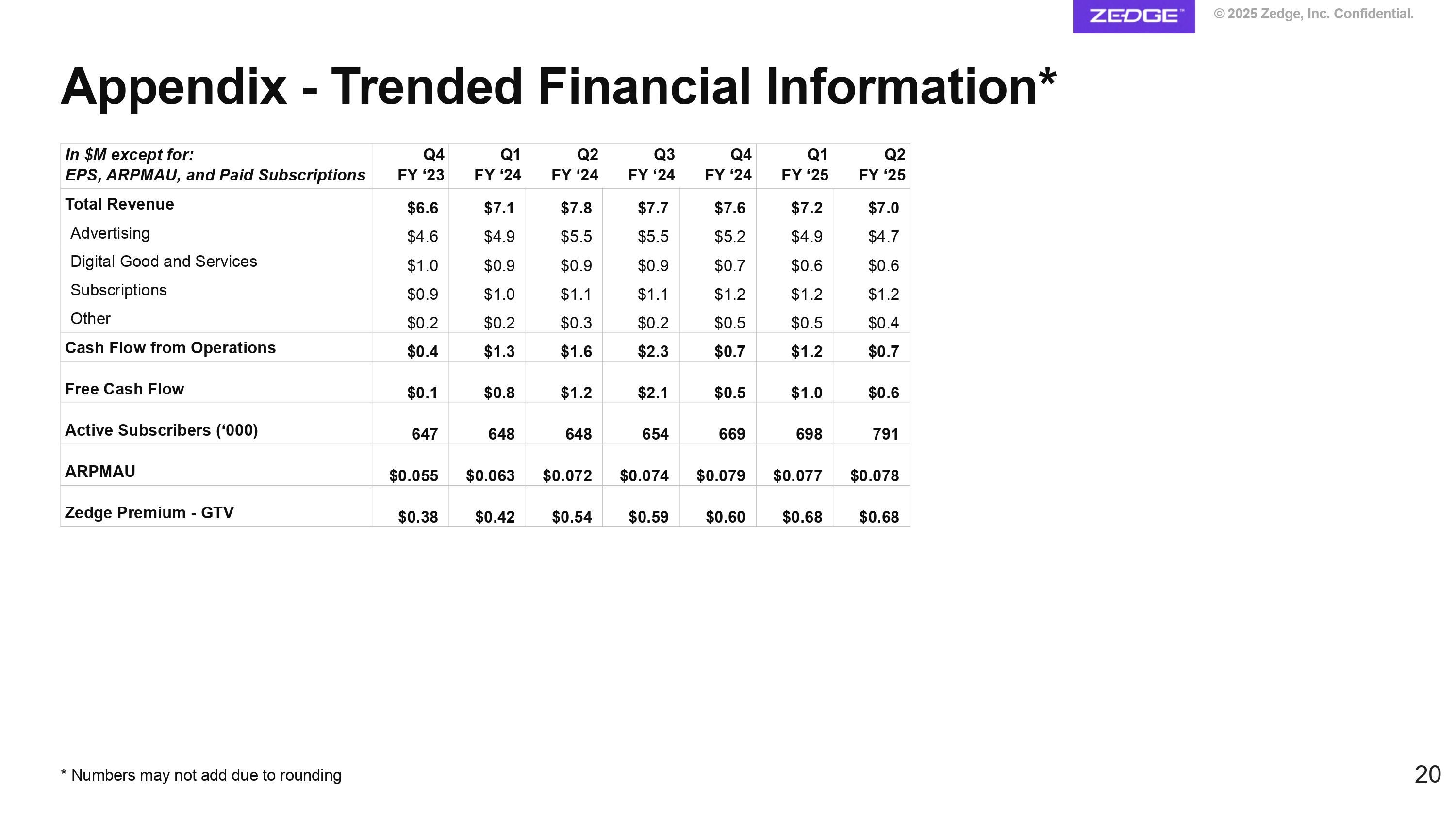 © 2025 Zedge, Inc. Confidential. 19 H1 FY FY Q2 Q1 Q4 Q3 Q2 Q1 Q4 Q3 Q2 Q1 FY ‘25 2024 2023 FY ‘25 FY ‘25 FY ‘24 FY ‘24 FY ‘24 FY ‘24 FY ‘23 FY ‘23 FY ‘23 FY ‘23 Free Cash Flow Calculation $1.9 $0.3 $5.9 $1.2 $3.2 $1.5 $0.7 $0.1 $1.2 $0.2 $0.7 $0.2 $2.3 $0.2 $1.6 $0.4 $1.3 $0.4 $0.4 $0.3 $1.6 $0.4 $0.0 $0.4 $1.1 $0.3 Cash Flow from Operations Capital Expenditures $1.6 $4.7 $1.7 $0.6 $1.0 $0.5 $2.1 $1.2 $0.8 $0.1 $1.2 ($0.3) $0.7 Free Cash Flow Appendix - Reconciliation of Non - GAAP Financial Metrics TTM Free Cash Flow Yield Calculation ($M except for FCF yield) $28.9 $20.1 Market Cap (April 16, 2025) Cash as of January 31, 2025 $8.8 Enterprise Value $4.3 TTM FCF 48.1% FCF Yield