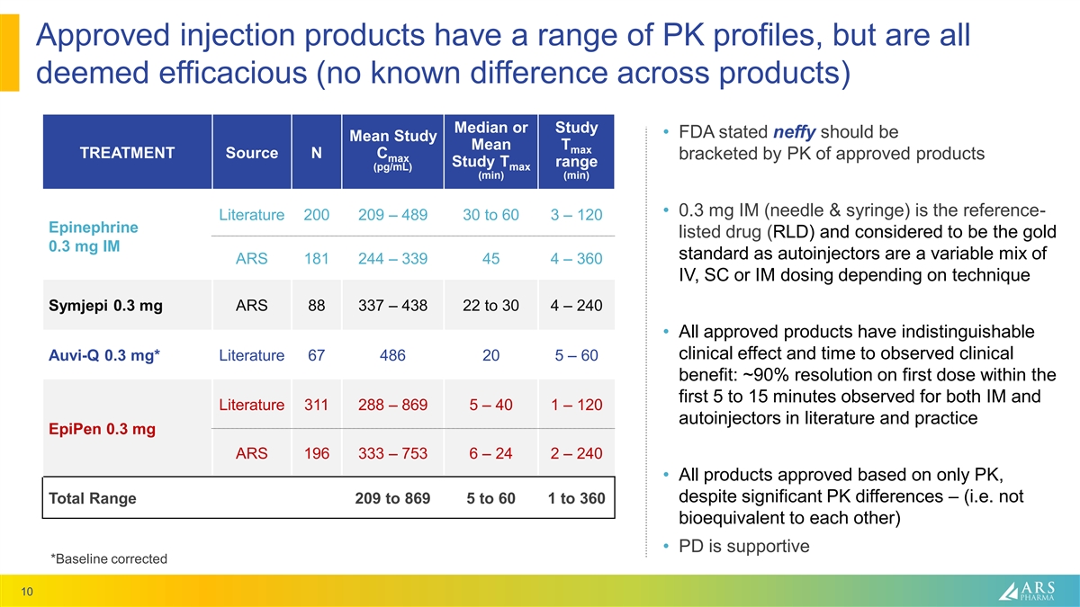 Limitations of injection lead to hesitation and decreased or ineffective usage neffy may address these limitations to transform the treatment paradigm 1 2 3 4 PROBLEM NO TREATMENT REFUSAL OF FAILURE OF DELAY IN Only 10% - AVAILABLE TREATMENT TREATMENT TREATMENT 20% of Rx 1, 3, 5 2 4 ~50% of ~25% - 50% ~40 - 60% of 23 - 35% fail to filled or used 1 patients carry do not administer patients delay dose correctly 6 as indicated 1 2 3 4 neffy® NO NEEDLE EASIER AND MORE RELIABLE SMALL SOLUTIONS NO INJECTION CONSISTENT DOSING • 99.999% delivery of effective • Fits in your pocket; dose in reliability testing; • Rapid administration • 0% critical dosing errors can carry more than 1 no inhalation required without a needle in registration • ~10% of cases self-administration study • Same shelf-life as EpiPen, but • No risk of needle-related require multiple 2 also stable at high temperatures injuries; lacerations or • Low 2 mg dose of doses of 1 cardiotoxic blood vessel epinephrine achieves epinephrine injections comparable PK without overexposure risk • Less hesitation to dose Demonstrated PK and PD comparable to injection Sources: (1) Warren et al. Ann Allergy Asthma Immunol (2018), (2) Data on file from ARS market research, (3) Brooks et al. Ann Allergy Asthma Immunol (2017), (4) El Turki et al. 9 Emerg Med J (2017), (5) Asthma and Allergy Foundation of America Patient Survey Report (2019), (6) Company estimates based on prior references (1) through (5) and IQVIA data
