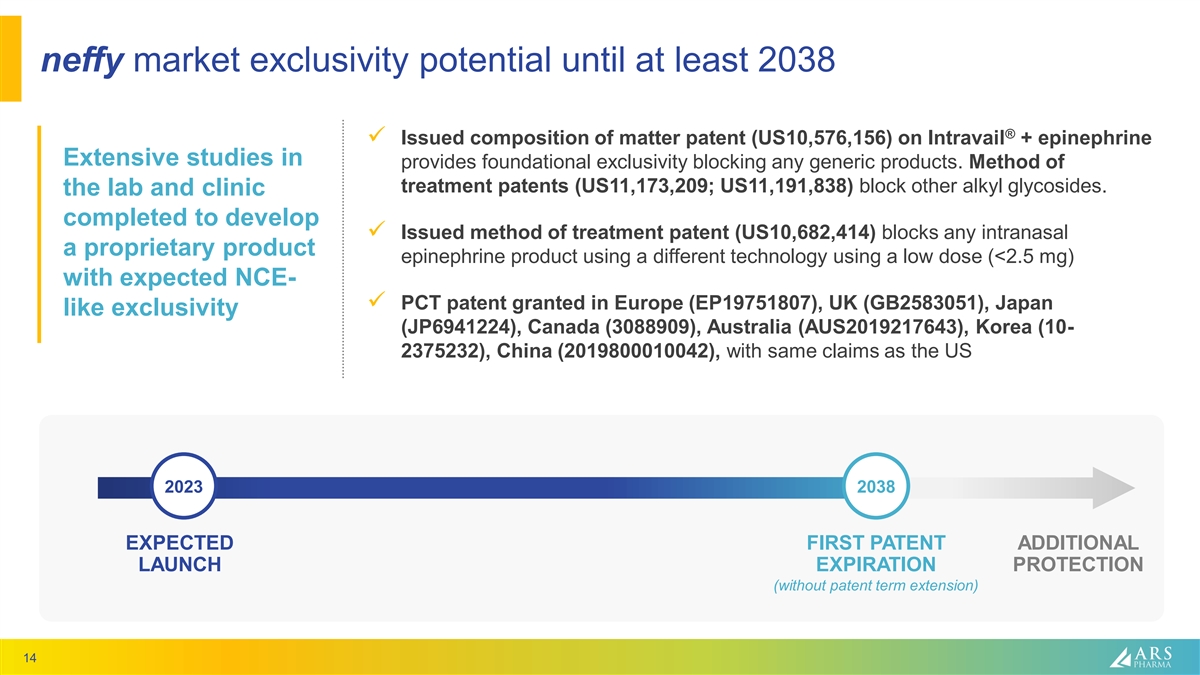 neffy market exclusivity potential until at least 2038 ® ✓ Issued composition of matter patent (US10,576,156) on Intravail + epinephrine Extensive studies in provides foundational exclusivity blocking any generic products. Method of treatment patents (US11,173,209; US11,191,838) block other alkyl glycosides. the lab and clinic completed to develop ✓ Issued method of treatment patent (US10,682,414) blocks any intranasal a proprietary product epinephrine product using a different technology using a low dose (<2.5 mg) with expected NCE- ✓ PCT patent granted in Europe (EP19751807), UK (GB2583051), Japan like exclusivity (JP6941224), Canada (3088909), Australia (AUS2019217643), Korea (10- 2375232), China (2019800010042), with same claims as the US 2023 2038 EXPECTED FIRST PATENT ADDITIONAL LAUNCH EXPIRATION PROTECTION (without patent term extension) 14