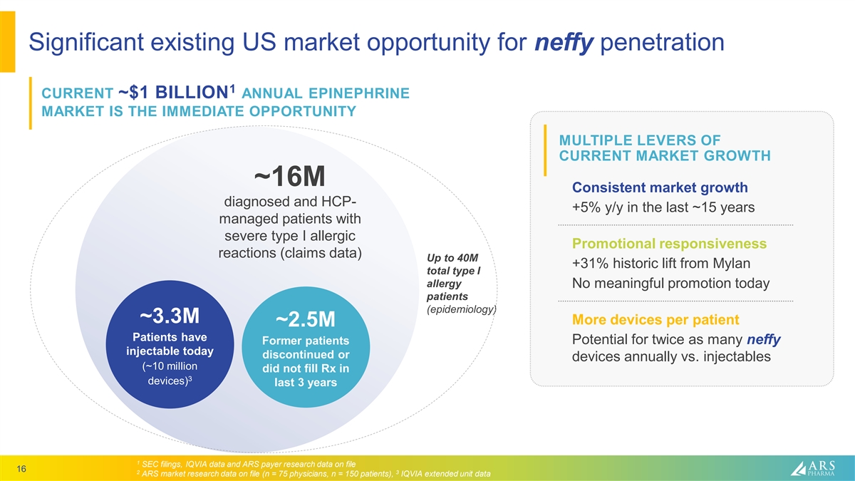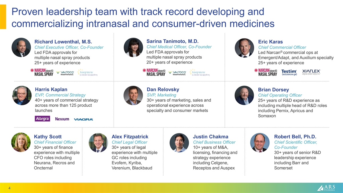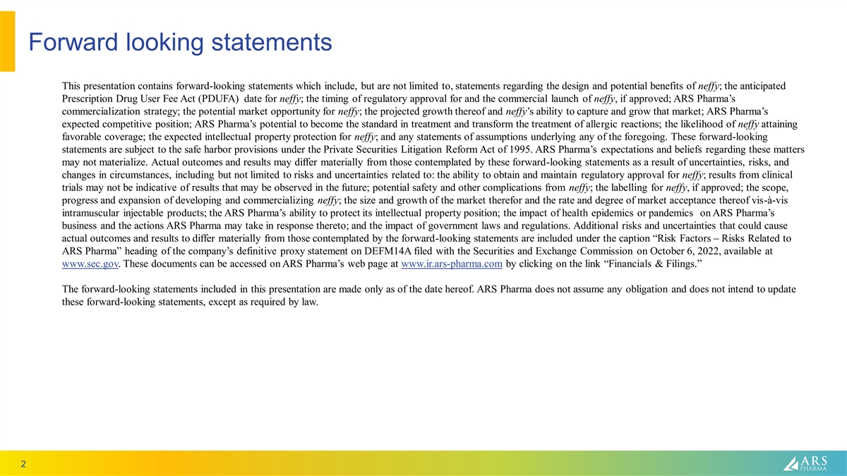 Forward looking statements This presentation contains forward-looking statements which include, but are not limited to, statements regarding the design and potential benefits of neffy; the anticipated Prescription Drug User Fee Act (PDUFA) date for neffy; the timing of regulatory approval for and the commercial launch of neffy, if approved; ARS Pharma’s commercialization strategy; the potential market opportunity for neffy; the projected growth thereof and neffy’s ability to capture and grow that market; ARS Pharma’s expected competitive position; ARS Pharma’s potential to become the standard in treatment and transform the treatment of allergic reactions; the likelihood of neffy attaining favorable coverage; the expected intellectual property protection for neffy; and any statements of assumptions underlying any of the foregoing. These forward-looking statements are subject to the safe harbor provisions under the Private Securities Litigation Reform Act of 1995. ARS Pharma’s expectations and beliefs regarding these matters may not materialize. Actual outcomes and results may differ materially from those contemplated by these forward-looking statements as a result of uncertainties, risks, and changes in circumstances, including but not limited to risks and uncertainties related to: the ability to obtain and maintain regulatory approval for neffy; results from clinical trials may not be indicative of results that may be observed in the future; potential safety and other complications from neffy; the labelling for neffy, if approved; the scope, progress and expansion of developing and commercializing neffy; the size and growth of the market therefor and the rate and degree of market acceptance thereof vis-à-vis intramuscular injectable products; the ARS Pharma’s ability to protect its intellectual property position; the impact of health epidemics or pandemics on ARS Pharma’s business and the actions ARS Pharma may take in response thereto; and the impact of government laws and regulations. Additional risks and uncertainties that could cause actual outcomes and results to differ materially from those contemplated by the forward-looking statements are included under the caption “Risk Factors – Risks Related to ARS Pharma” heading of the company’s definitive proxy statement on DEFM14A filed with the Securities and Exchange Commission on October 6, 2022, available at www.sec.gov. These documents can be accessed on ARS Pharma’s web page at www.ir.ars-pharma.com by clicking on the link “Financials & Filings.” The forward-looking statements included in this presentation are made only as of the date hereof. ARS Pharma does not assume any obligation and does not intend to update these forward-looking statements, except as required by law. 2