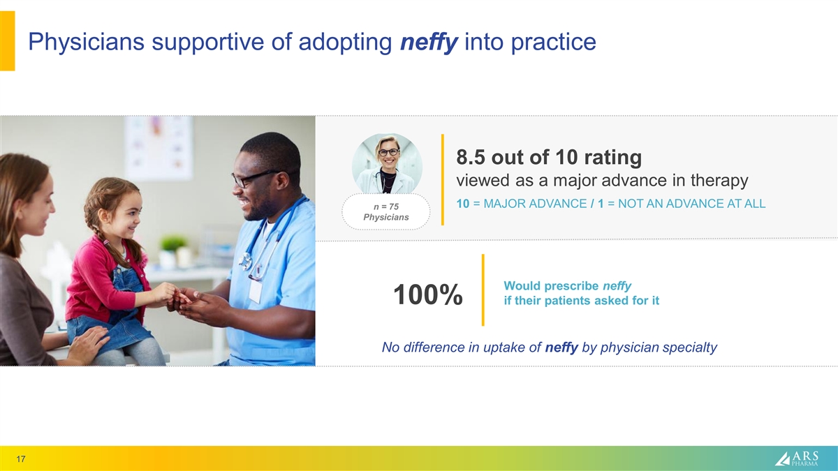 Significant existing US market opportunity for neffy penetration 1 CURRENT ~$1 BILLION ANNUAL EPINEPHRINE MARKET IS THE IMMEDIATE OPPORTUNITY MULTIPLE LEVERS OF CURRENT MARKET GROWTH ~16M Consistent market growth diagnosed and HCP- +5% y/y in the last ~15 years managed patients with severe type I allergic Promotional responsiveness reactions (claims data) Up to 40M +31% historic lift from Mylan total type I allergy No meaningful promotion today patients (epidemiology) ~3.3M More devices per patient ~2.5M Patients have Former patients Potential for twice as many neffy injectable today discontinued or devices annually vs. injectables (~10 million did not fill Rx in 3 devices) last 3 years 1 SEC filings, IQVIA data and ARS payer research data on file 16 2 3 ARS market research data on file (n = 75 physicians, n = 150 patients), IQVIA extended unit data