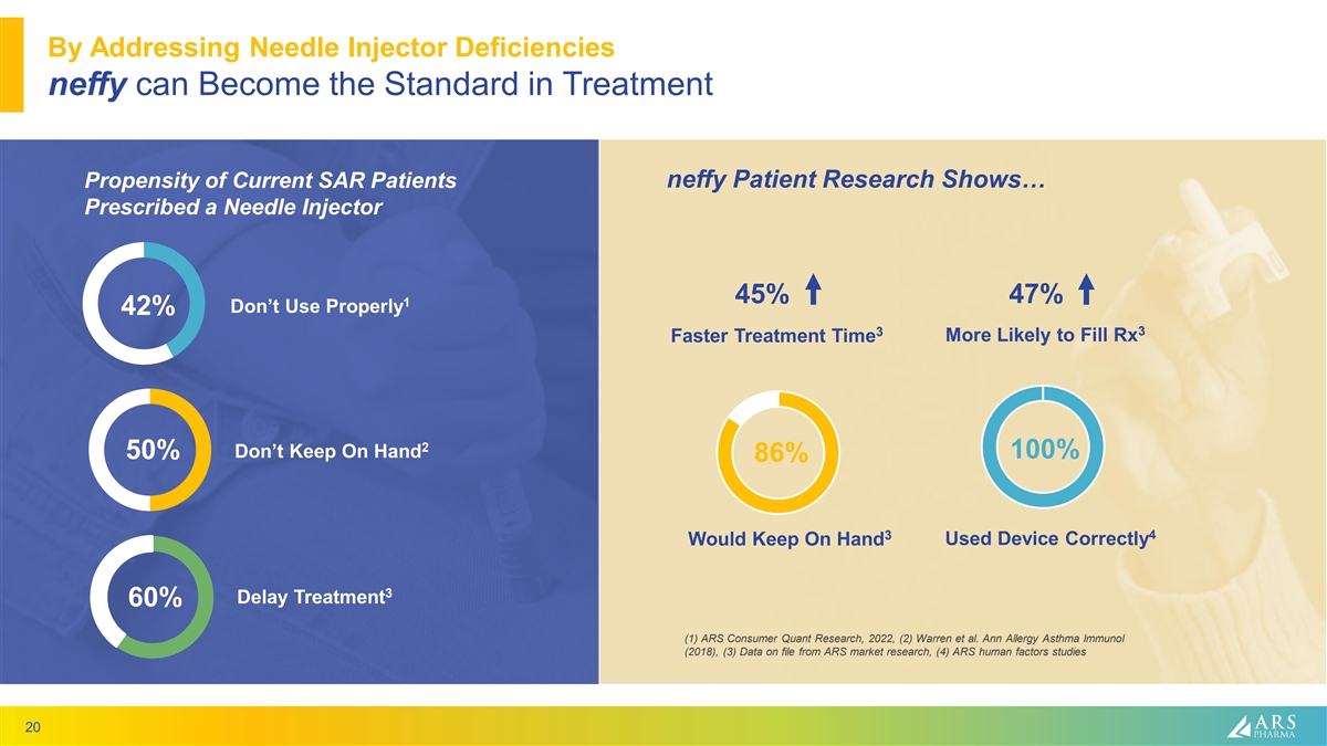 Caregivers are enthusiastic about neffy and its benefits Time from Onset of Symptoms to Epinephrine Administration Current neffy I want this. Is it 9.3 This is fantastic. available yet? Let me 8.8 Much easier than know when it is, I will 8.3 jabbing the thigh. literally call the doctor from my car. – Father – Mother 5.1 4.9 4.7 We are talking about I don’t have a co-pay, someone’s life and but I’d get this for my lifestyle here. Great daughters even if I improvement. have to pay $50. Total Caregivers Patients – Mother – Mother N=200 N=100 N=100 Source: ARS Consumer Quant Research, 2022 Guidelines recommend immediate treatment with epinephrine. Earlier administration is associated with improved clinical outcomes and decreased likelihood of hospitalizations. 19 Avg # of Minutes Before Using Device “ “ “ “