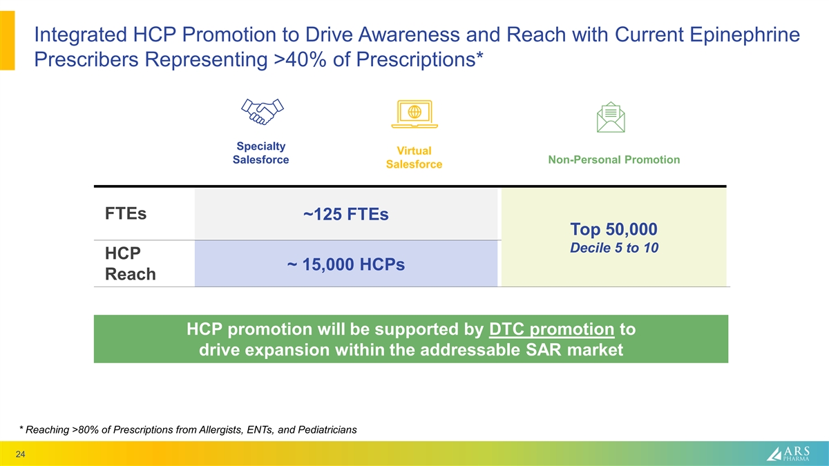 Integrated HCP Promotion to Drive Awareness and Reach with Current Epinephrine Prescribers Representing >40% of Prescriptions* Specialty Virtual Salesforce Non-Personal Promotion Salesforce FTEs ~125 FTEs Top 50,000 Decile 5 to 10 HCP ~ 15,000 HCPs Reach HCP promotion will be supported by DTC promotion to drive expansion within the addressable SAR market * Reaching >80% of Prescriptions from Allergists, ENTs, and Pediatricians 24