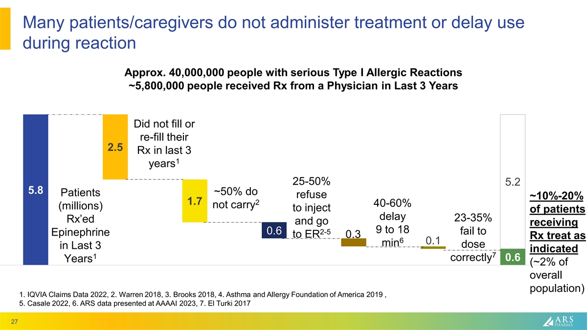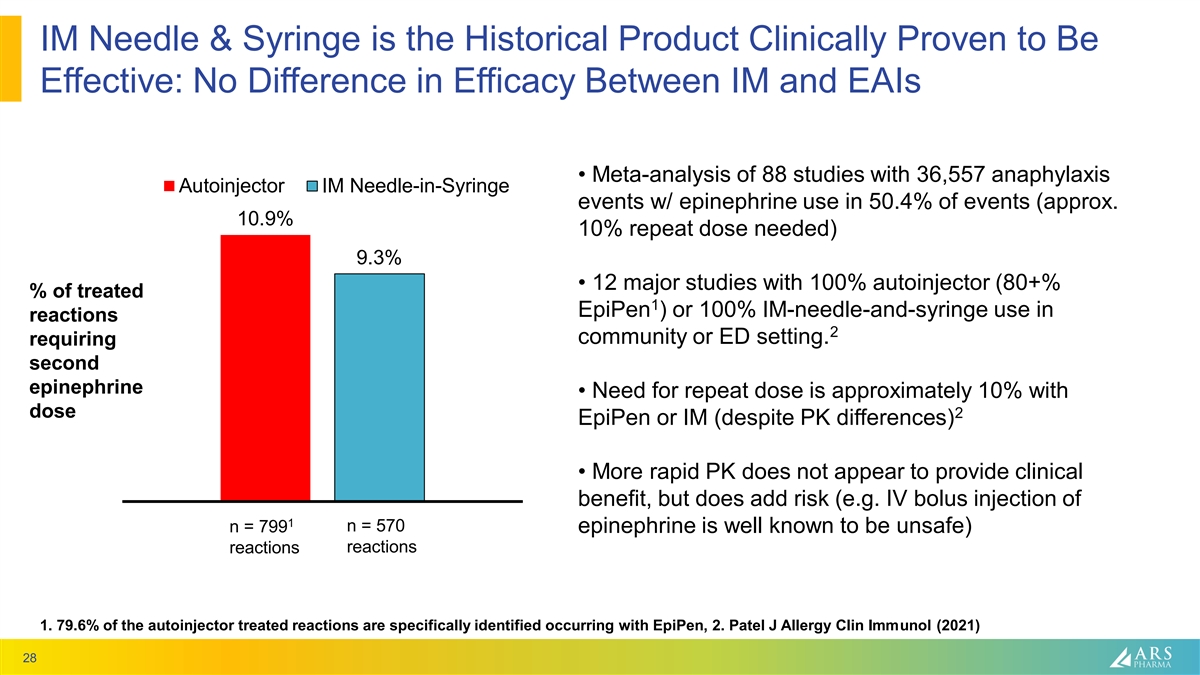 Many patients/caregivers do not administer treatment or delay use during reaction Approx. 40,000,000 people with serious Type I Allergic Reactions ~5,800,000 people received Rx from a Physician in Last 3 Years Did not fill or re-fill their 2.5 Rx in last 3 1 years 25-50% 5.2 5.8 ~50% do Patients refuse ~10%-20% 1.7 2 40-60% not carry (millions) to inject of patients delay 23-35% Rx’ed and go receiving 9 to 18 0.6 2-5 fail to Epinephrine to ER 0.3 Rx treat as 6 0.1 min dose in Last 3 indicated 7 1 correctly 0.6 Years (~2% of overall Patients Rx by # not filling Rx # not carrying # not dosing # delaying # not using Total population) Physician dose correctly proportion 1. IQVIA Claims Data 2022, 2. Warren 2018, 3. Brooks 2018, 4. Asthma and Allergy Foundation of America 2019 , 5. Casale 2022, 6. ARS data presented at AAAAI 2023, 7. El Turki 2017 27