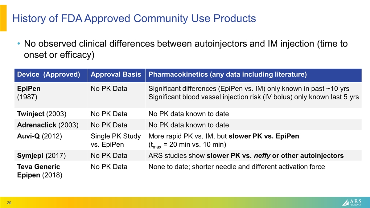 History of FDA Approved Community Use Products • No observed clinical differences between autoinjectors and IM injection (time to onset or efficacy) Device (Approved) Approval Basis Pharmacokinetics (any data including literature) EpiPen No PK Data Significant differences (EpiPen vs. IM) only known in past ~10 yrs (1987) Significant blood vessel injection risk (IV bolus) only known last 5 yrs Twinject (2003) No PK Data No PK data known to date Adrenaclick (2003) No PK Data No PK data known to date Auvi-Q (2012) Single PK Study More rapid PK vs. IM, but slower PK vs. EpiPen vs. EpiPen (t = 20 min vs. 10 min) max Symjepi (2017) No PK Data ARS studies show slower PK vs. neffy or other autoinjectors Teva Generic No PK Data None to date; shorter needle and different activation force Epipen (2018) 29
