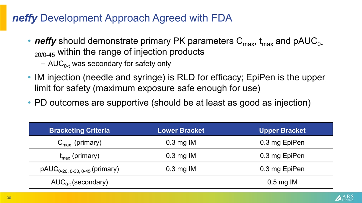 neffy Development Approach Agreed with FDA • neffy should demonstrate primary PK parameters C , t and pAUC max max 0- within the range of injection products 20/0-45 – AUC was secondary for safety only 0-t • IM injection (needle and syringe) is RLD for efficacy; EpiPen is the upper limit for safety (maximum exposure safe enough for use) • PD outcomes are supportive (should be at least as good as injection) Bracketing Criteria Lower Bracket Upper Bracket C (primary) 0.3 mg IM 0.3 mg EpiPen max t (primary) 0.3 mg IM 0.3 mg EpiPen max pAUC (primary) 0.3 mg IM 0.3 mg EpiPen 0-20, 0-30, 0-45 AUC (secondary) 0.5 mg IM 0-t 30