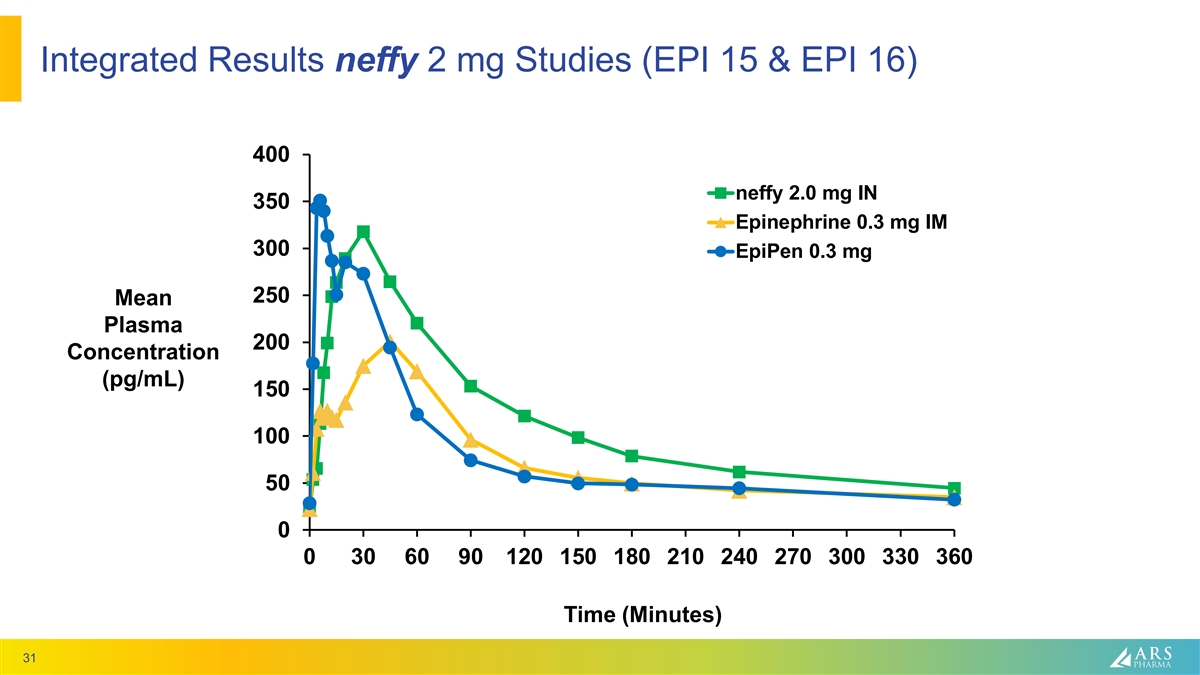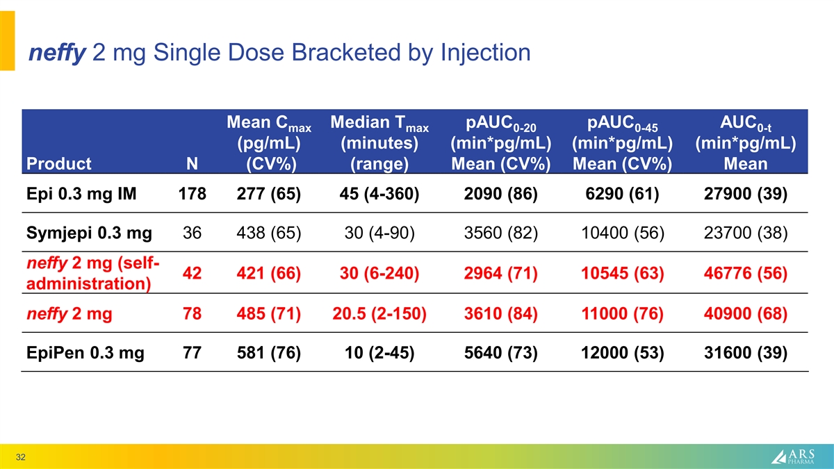 Integrated Results neffy 2 mg Studies (EPI 15 & EPI 16) 400 neffy 2.0 mg IN 350 Epinephrine 0.3 mg IM 300 EpiPen 0.3 mg 250 Mean Plasma 200 Concentration (pg/mL) 150 100 50 0 0 30 60 90 120 150 180 210 240 270 300 330 360 Time (Minutes) 31