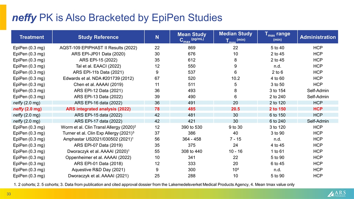 neffy PK is Also Bracketed by EpiPen Studies Median Study T range Mean Study max Treatment Study Reference N Administration (pg/mL) (min) (min) C T max max EpiPen (0.3 mg) AQST-109 EPIPHAST II Results (2022) 22 869 22 5 to 40 HCP EpiPen (0.3 mg) ARS EPI-JP01 Data (2020) 30 676 10 2 to 45 HCP EpiPen (0.3 mg) ARS EPI-15 (2022) 35 612 8 2 to 45 HCP EpiPen (0.3 mg) Tal et al. EAACI (2022) 12 550 9 n.d. HCP EpiPen (0.3 mg) ARS EPI-11b Data (2021) 9 537 6 2 to 6 HCP EpiPen (0.3 mg) Edwards et al. NDA #201739 (2012) 67 520 10.2 4 to 60 HCP EpiPen (0.3 mg) Chen et al. AAAAI (2019) 11 511 5 3 to 50 HCP EpiPen (0.3 mg) ARS EPI-12 Data (2021) 36 493 8 3 to 154 Self-Admin EpiPen (0.3 mg) ARS EPI-13 Data (2022) 39 490 6 2 to 240 Self-Admin neffy (2.0 mg) ARS EPI-16 data (2022) 36 491 20 2 to 120 HCP neffy (2.0 mg) ARS integrated analysis (2022) 78 485 20.5 2 to 150 HCP neffy (2.0 mg) ARS EPI-15 data (2022) 42 481 30 6 to 150 HCP neffy (2.0 mg) ARS EPI-17 data (2022) 42 421 30 6 to 240 Self-Admin 2 EpiPen (0.3 mg) Worm et al. Clin Transl Allergy (2020) 12 390 to 530 9 to 30 3 to 120 HCP 3 EpiPen (0.3 mg) Turner et al. Clin Exp Allergy (2021) 37 386 40 3 to 90 HCP 1 EpiPen (0.3 mg) Amphastar US2021/030502 (2021) 56 364 - 458 7 - 15 n.d. HCP EpiPen (0.3 mg) ARS EPI-07 Data (2019) 35 375 24 4 to 45 HCP 1 EpiPen (0.3 mg) Dworaczyk et al. AAAAI (2020) 55 308 to 440 10 - 16 1 to 61 HCP EpiPen (0.3 mg) Oppenheimer et al. AAAAI (2022) 10 341 22 5 to 90 HCP EpiPen (0.3 mg) ARS EPI-01 Data (2018) 12 333 20 6 to 45 HCP 4 EpiPen (0.3 mg) Aquestive R&D Day (2021) 9 300 10 n.d. HCP EpiPen (0.3 mg) Dworaczyk et al. AAAAI (2021) 25 288 10 5 to 90 HCP 1. 2 cohorts; 2. 5 cohorts; 3. Data from publication and cited approval dossier from the Lakemedelsverket Medical Products Agency, 4. Mean tmax value only 33