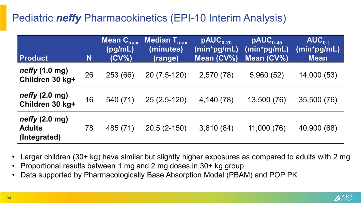 Pediatric neffy Pharmacokinetics (EPI-10 Interim Analysis) Mean C Median T pAUC pAUC AUC max max 0-20 0-45 0-t (pg/mL) (minutes) (min*pg/mL) (min*pg/mL) (min*pg/mL) Product N (CV%) (range) Mean (CV%) Mean (CV%) Mean neffy (1.0 mg) 26 253 (66) 20 (7.5-120) 2,570 (78) 5,960 (52) 14,000 (53) Children 30 kg+ neffy (2.0 mg) 16 540 (71) 25 (2.5-120) 4,140 (78) 13,500 (76) 35,500 (76) Children 30 kg+ neffy (2.0 mg) Adults 78 485 (71) 20.5 (2-150) 3,610 (84) 11,000 (76) 40,900 (68) (Integrated) • Larger children (30+ kg) have similar but slightly higher exposures as compared to adults with 2 mg • Proportional results between 1 mg and 2 mg doses in 30+ kg group • Data supported by Pharmacologically Base Absorption Model (PBAM) and POP PK 34