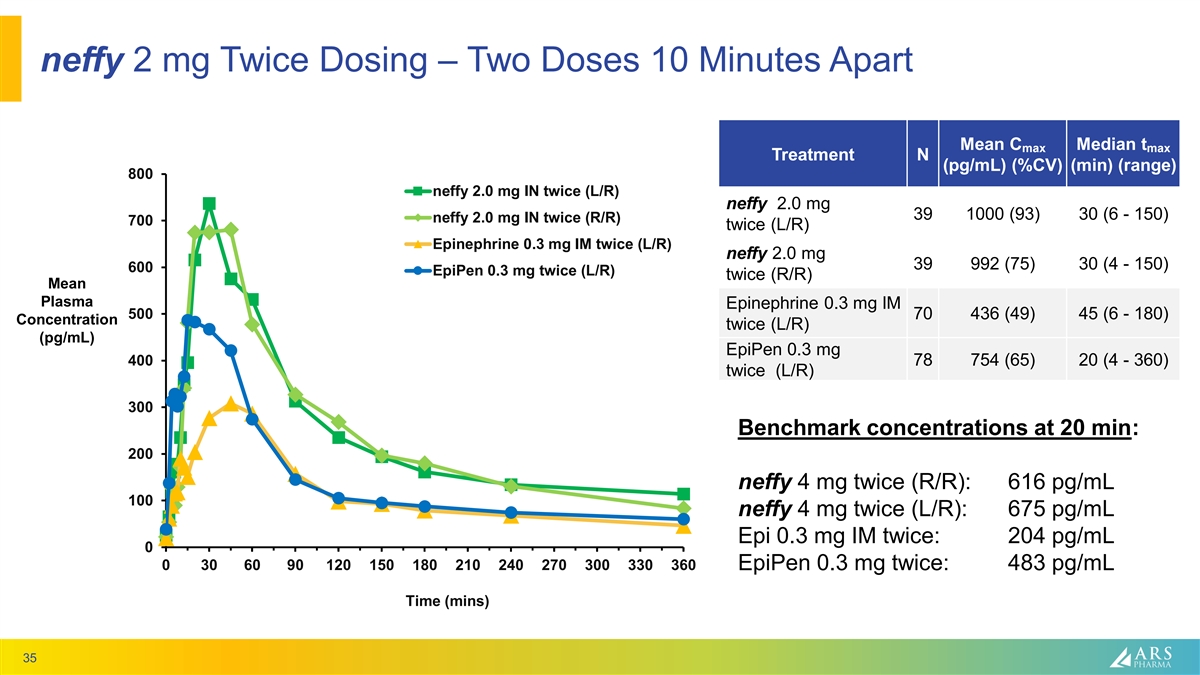 neffy 2 mg Twice Dosing – Two Doses 10 Minutes Apart Mean C Median t max max Treatment N (pg/mL) (%CV) (min) (range) 800 neffy 2.0 mg IN twice (L/R) neffy 2.0 mg 39 1000 (93) 30 (6 - 150) neffy 2.0 mg IN twice (R/R) 700 twice (L/R) Epinephrine 0.3 mg IM twice (L/R) neffy 2.0 mg 39 992 (75) 30 (4 - 150) 600 EpiPen 0.3 mg twice (L/R) twice (R/R) Mean Plasma Epinephrine 0.3 mg IM 500 70 436 (49) 45 (6 - 180) Concentration twice (L/R) (pg/mL) EpiPen 0.3 mg 400 78 754 (65) 20 (4 - 360) twice (L/R) 300 Benchmark concentrations at 20 min: 200 neffy 4 mg twice (R/R): 616 pg/mL 100 neffy 4 mg twice (L/R): 675 pg/mL Epi 0.3 mg IM twice: 204 pg/mL 0 0 30 60 90 120 150 180 210 240 270 300 330 360 EpiPen 0.3 mg twice: 483 pg/mL Time (mins) 35