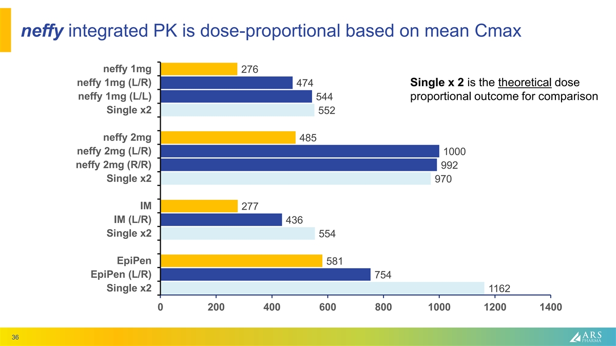 neffy integrated PK is dose-proportional based on mean Cmax neffy 1mg 276 neffy 1mg (L/R) 474 Single x 2 is the theoretical dose neffy 1mg (L/L) proportional outcome for comparison 544 Single x2 552 neffy 2mg 485 neffy 2mg (L/R) 1000 neffy 2mg (R/R) 992 Single x2 970 IM 277 IM (L/R) 436 Single x2 554 EpiPen 581 EpiPen (L/R) 754 Single x2 1162 0 200 400 600 800 1000 1200 1400 36