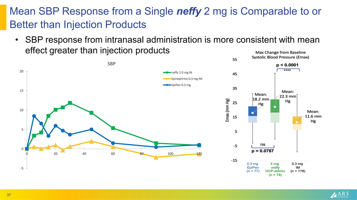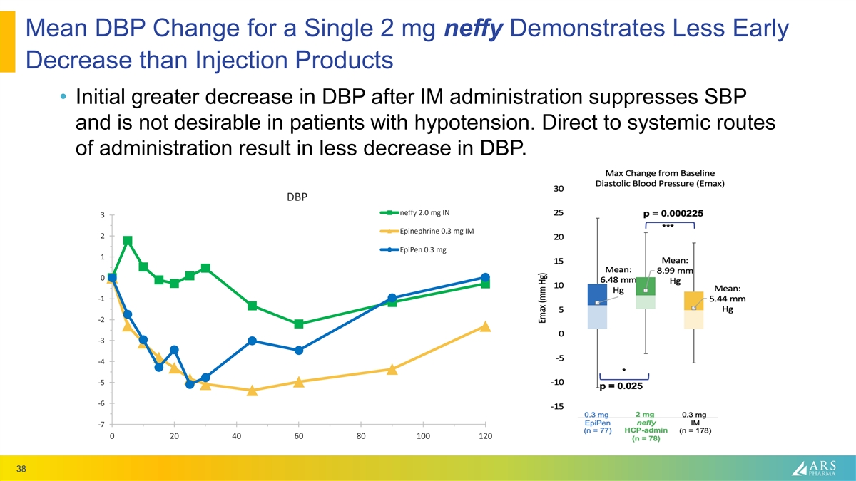 Mean SBP Response from a Single neffy 2 mg is Comparable to or Better than Injection Products • SBP response from intranasal administration is more consistent with mean effect greater than injection products SBP 20 neffy 2.0 mg IN Epinephrine 0.3 mg IM EpiPen 0.3 mg 15 10 5 0 0 20 40 60 80 100 120 -5 37