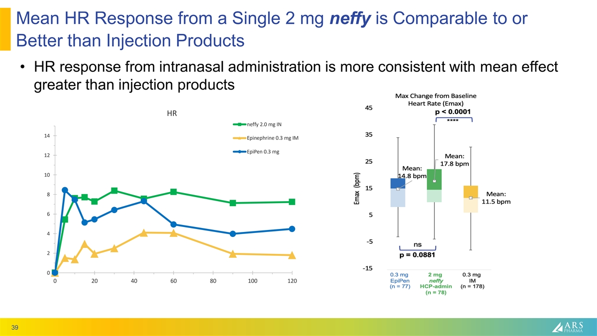 Mean DBP Change for a Single 2 mg neffy Demonstrates Less Early Decrease than Injection Products • Initial greater decrease in DBP after IM administration suppresses SBP and is not desirable in patients with hypotension. Direct to systemic routes of administration result in less decrease in DBP. DBP neffy 2.0 mg IN 3 Epinephrine 0.3 mg IM 2 EpiPen 0.3 mg 1 0 -1 -2 -3 -4 -5 -6 -7 0 20 40 60 80 100 120 38