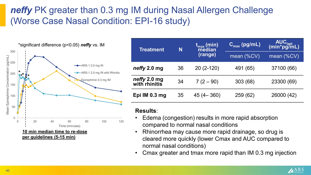 neffy PK greater than 0.3 mg IM during Nasal Allergen Challenge (Worse Case Nasal Condition: EPI-16 study) AUC last C (pg/mL) *significant difference (p<0.05) neffy vs. IM t (min) max max (min*pg/mL) Treatment N median 300 (range) mean (%CV) mean (%CV) 250 ARS-1 2.0 mg IN neffy 2.0 mg 36 20 (2-120) 491 (65) 37100 (66) ARS-1 2.0 mg IN with Rhinitis 200 * * * * * Epinephrine 0.3 mg IM neffy 2.0 mg 34 7 (2 – 90) 303 (68) 23300 (69) 150 with rhinitis 100 Epi IM 0.3 mg 35 45 (4– 360) 259 (62) 26000 (42) 50 Results: 0 • Edema (congestion) results in more rapid absorption 0 20 40 60 80 100 120 compared to normal nasal conditions Time (minutes) 10 min median time to re-dose • Rhinorrhea may cause more rapid drainage, so drug is per guidelines (5-15 min) cleared more quickly (lower Cmax and AUC compared to normal nasal conditions) • Cmax greater and tmax more rapid than IM 0.3 mg injection 40 Mean Epinephrine Concentration (pg/mL)