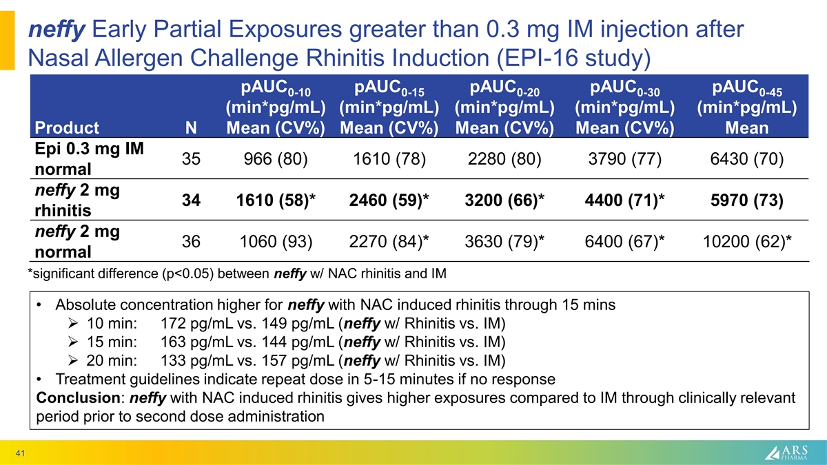 neffy Early Partial Exposures greater than 0.3 mg IM injection after Nasal Allergen Challenge Rhinitis Induction (EPI-16 study) pAUC pAUC pAUC pAUC pAUC 0-10 0-15 0-20 0-30 0-45 (min*pg/mL) (min*pg/mL) (min*pg/mL) (min*pg/mL) (min*pg/mL) Product N Mean (CV%) Mean (CV%) Mean (CV%) Mean (CV%) Mean Epi 0.3 mg IM 35 966 (80) 1610 (78) 2280 (80) 3790 (77) 6430 (70) normal neffy 2 mg 34 1610 (58)* 2460 (59)* 3200 (66)* 4400 (71)* 5970 (73) rhinitis neffy 2 mg 36 1060 (93) 2270 (84)* 3630 (79)* 6400 (67)* 10200 (62)* normal *significant difference (p<0.05) between neffy w/ NAC rhinitis and IM • Absolute concentration higher for neffy with NAC induced rhinitis through 15 mins ➢ 10 min: 172 pg/mL vs. 149 pg/mL (neffy w/ Rhinitis vs. IM) ➢ 15 min: 163 pg/mL vs. 144 pg/mL (neffy w/ Rhinitis vs. IM) ➢ 20 min: 133 pg/mL vs. 157 pg/mL (neffy w/ Rhinitis vs. IM) • Treatment guidelines indicate repeat dose in 5-15 minutes if no response Conclusion: neffy with NAC induced rhinitis gives higher exposures compared to IM through clinically relevant period prior to second dose administration 41