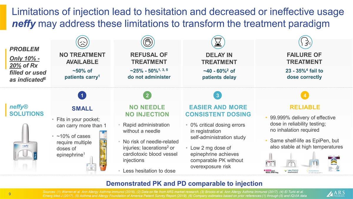 Epinephrine is effective, but significant device limitations exist Epinephrine recognized as the only first-line therapy by 1 allergy society treatment guidelines , but… Safety concerns: lacerations, Apprehension to dose due to caregiver self-injection, blood needle vessel hits Lack of portability Lack of reliability Reluctance to use in public Not user friendly 1 Sources: Anaphylaxis – a 2020 practice parameter update, systematic review and Grading Recommendations, Assessment, Development and Evaluation (GRADE) analysis 7