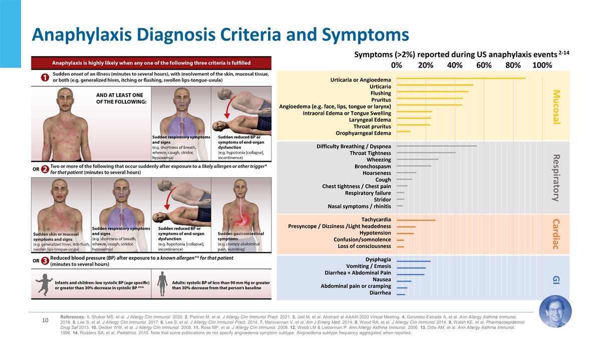 Mucosal Respiratory Cardiac GI Anaphylaxis Diagnosis Criteria and Symptoms 2-14 Symptoms (>2%) reported during US anaphylaxis events 0% 20% 40% 60% 80% 100% Urticaria or Angioedema Urticaria Flushing Pruritus Angioedema (e.g. face, lips, tongue or larynx) Intraoral Edema or Tongue Swelling Laryngeal Edema Throat pruritus Orophyarngeal Edema Difficulty Breathing / Dyspnea Throat Tightness Wheezing Bronchospasm Hoarseness Cough Chest tightness / Chest pain Respiratory failure Stridor Nasal symptoms / rhinitis Tachycardia Presyncope / Dizziness /Light headedness Hypotension Confusion/somnolence Loss of consciousness Dysphagia Vomiting / Emesis Diarrhea + Abdominal Pain Nausea Abdominal pain or cramping Diarrhea References: 1. Shaker MS, et al. J Allergy Clin Immunol. 2020. 2. Pistiner M, et al. J Allergy Clin Immunol Pract. 2021. 3. Jalil M, et al. Abstract at AAAAI 2020 Virtual Meeting. 4. Gonzelez-Estrada A, et al. Ann Allergy Asthma Immunol. 10 2018. 5. Lee S, et al. J Allergy Clin Immunol. 2017. 6. Lee S, et al. J Allergy Clin Immunol Pract. 2014. 7. Manivannan V, et al. Am J Emerg Med. 2014. 8. Wood RA, et al. J Allergy Clin Immunol 2014. 9. Walsh KE, et al. Pharmacoepidemiol Drug Saf 2013. 10. Decker WW, et al. J Allergy Clin Immunol. 2008. 11. Ross MP, et al. J Allergy Clin Immunol. 2008. 12. Webb LM & Lieberman P. Ann Allergy Asthma Immunol. 2006. 13. Ditto AM, et al. Ann Allergy Asthma Immunol. 1996. 14. Rudders SA, et al. Pediatrics. 2010. Note that some publications do not specify angioedema symptom subtype. Angioedema subtype frequency aggregated when reported.
