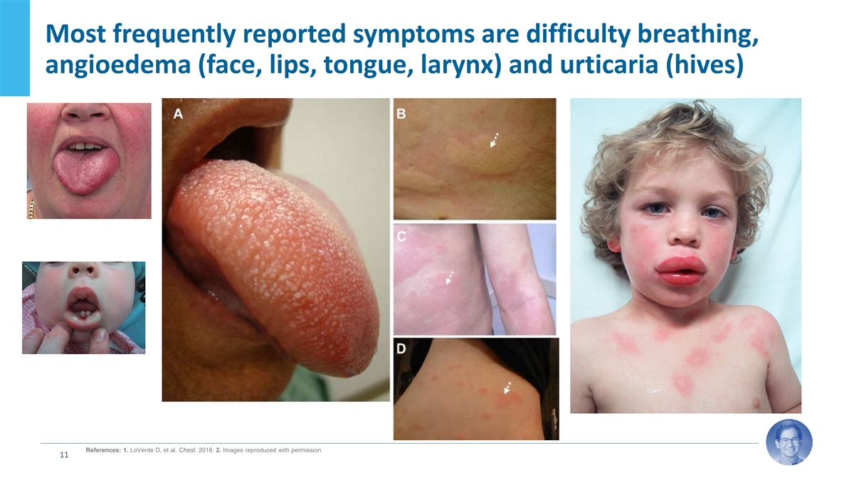 Most frequently reported symptoms are difficulty breathing, angioedema (face, lips, tongue, larynx) and urticaria (hives) References: 1. LoVerde D, et al. Chest. 2018. 2. Images reproduced with permission 11