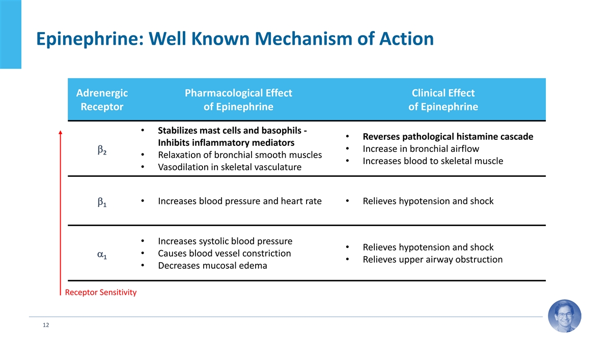 Epinephrine: Well Known Mechanism of Action Adrenergic Pharmacological Effect Clinical Effect Receptor of Epinephrine of Epinephrine • Stabilizes mast cells and basophils - • Reverses pathological histamine cascade Inhibits inflammatory mediators • Increase in bronchial airflow β 2 • Relaxation of bronchial smooth muscles • Increases blood to skeletal muscle • Vasodilation in skeletal vasculature β • Increases blood pressure and heart rate • Relieves hypotension and shock 1 • Increases systolic blood pressure • Relieves hypotension and shock • Causes blood vessel constriction α 1 • Relieves upper airway obstruction • Decreases mucosal edema Receptor Sensitivity 12