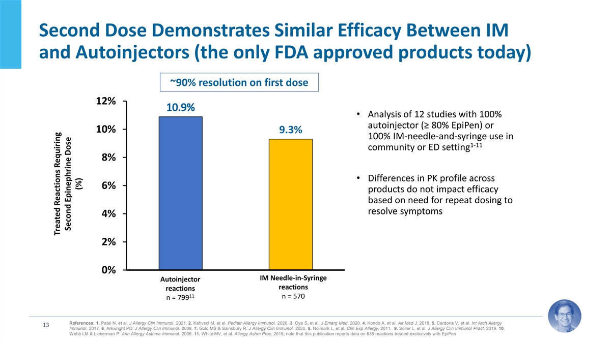 Second Dose Demonstrates Similar Efficacy Between IM and Autoinjectors (the only FDA approved products today) ~90% resolution on first dose 12% • Analysis of 12 studies with 100% autoinjector (≥ 80% EpiPen) or 10% 9.3% 100% IM-needle-and-syringe use in 1-11 community or ED setting 8% • Differences in PK profile across 6% products do not impact efficacy based on need for repeat dosing to resolve symptoms 4% 2% 0% IM Needle-in-Syringe Autoinjector % r equiring second dose reactions reactions 11 n = 570 n = 799 References: 1. Patel N, et al. J Allergy Clin Immunol. 2021. 2. Kahveci M, et al. Pediatr Allergy Immunol. 2020. 3. Oya S, et al. J Emerg Med. 2020. 4. Kondo A, et al. Air Med J. 2018. 5. Cardona V, et al. Int Arch Allergy 13 Immunol. 2017. 6. Arkwright PD. J Allergy Clin Immunol. 2008. 7. Gold MS & Sainsbury R. J Allergy Clin Immunol. 2020. 8. Noimark L, et al. Clin Exp Allergy. 2011. 9. Soller L, et al. J Allergy Clin Immunol Pract. 2019. 10. Webb LM & Lieberman P. Ann Allergy Asthma Immunol. 2006. 11. White MV, et al. Allergy Ashm Proc. 2015; note that this publication reports data on 636 reactions treated exclusively with EpiPen Treated Reactions Requiring Second Epinephrine Dose (%)