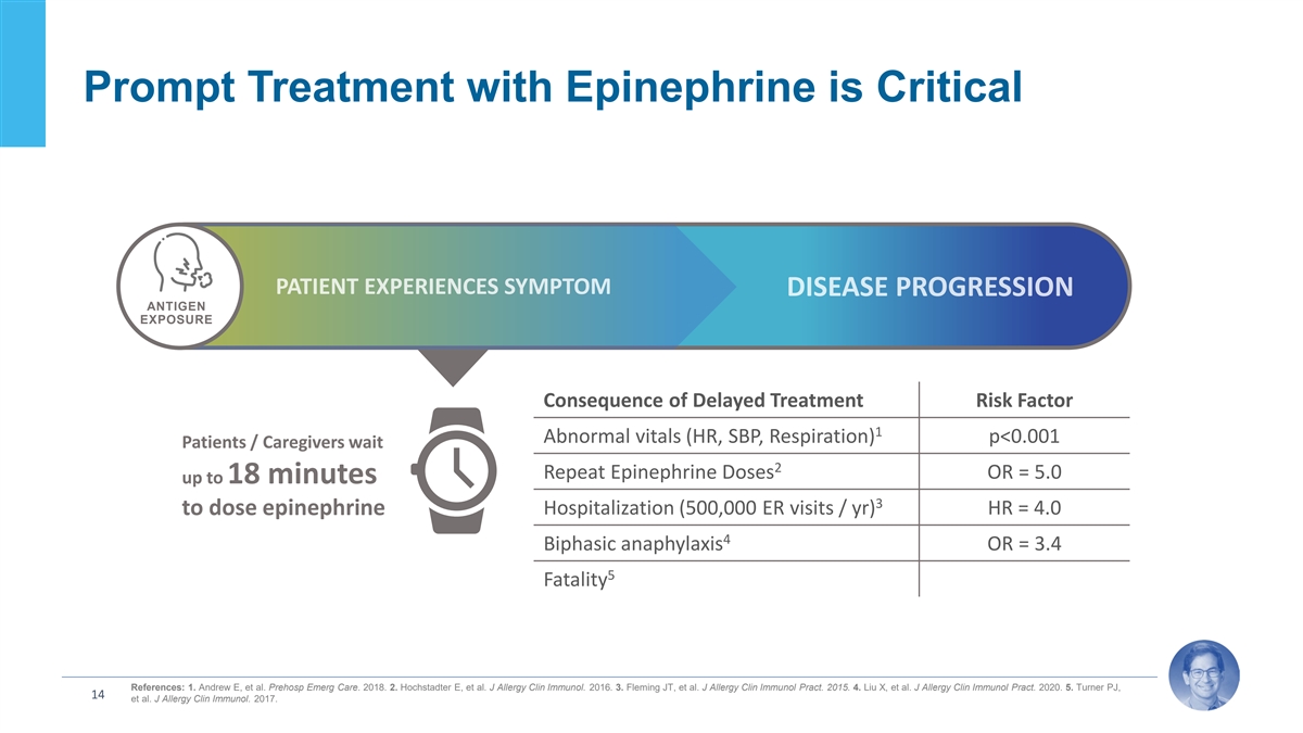 Prompt Treatment with Epinephrine is Critical ANTIGEN EXPOSURE Consequence of Delayed Treatment Risk Factor 1 Abnormal vitals (HR, SBP, Respiration) p<0.001 Patients / Caregivers wait 2 Repeat Epinephrine Doses OR = 5.0 up to 18 minutes 3 Hospitalization (500,000 ER visits / yr) HR = 4.0 to dose epinephrine 4 Biphasic anaphylaxis OR = 3.4 5 Fatality References: 1. Andrew E, et al. Prehosp Emerg Care. 2018. 2. Hochstadter E, et al. J Allergy Clin Immunol. 2016. 3. Fleming JT, et al. J Allergy Clin Immunol Pract. 2015. 4. Liu X, et al. J Allergy Clin Immunol Pract. 2020. 5. Turner PJ, 14 et al. J Allergy Clin Immunol. 2017.