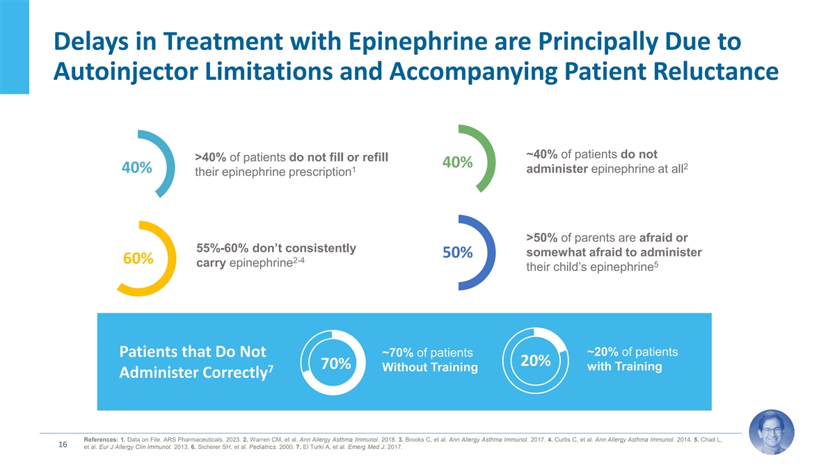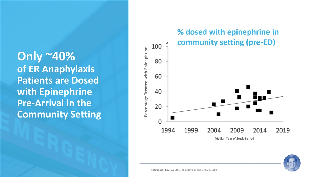 % dosed with epinephrine in b community setting (pre-ED) Only ~40% of ER Anaphylaxis Patients are Dosed with Epinephrine Pre-Arrival in the Community Setting Median Year of Study Period 15 References: 1. Mehta GD, et al. Expert Rev Clin Immunol. 2023. Percentage Treated with Epinephrine